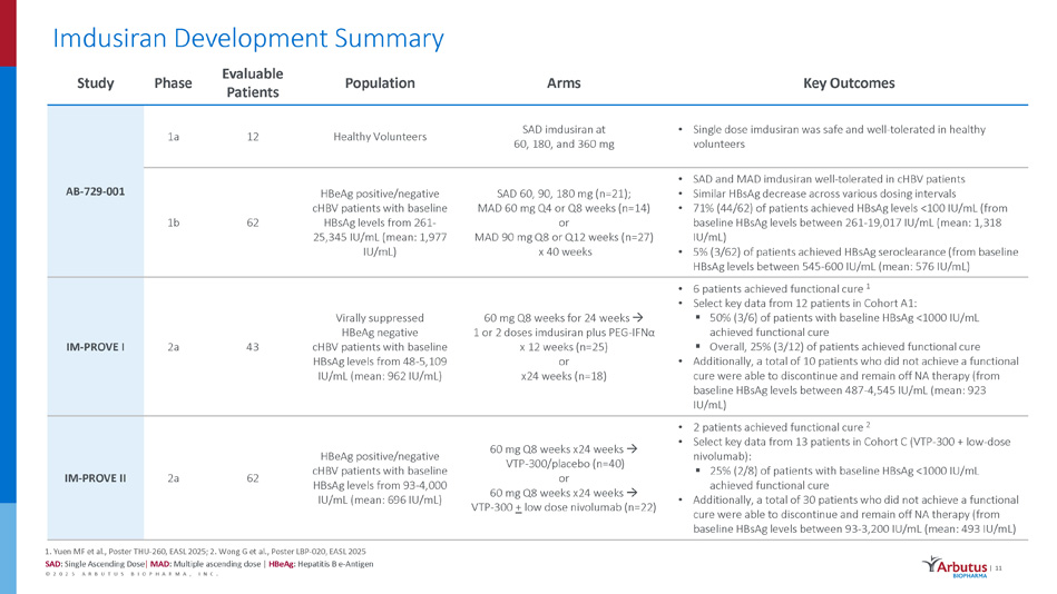 ©2025 ARBUTUS BIOPHARMA, INC . Imdusiran is Designed for Potential Best - In - Class Anti - HBV siRNA Properties Significant Structural Differences Compared to Other HBV Targeting siRNA Candidates | 10 *USAN file numbers LM - 78, KL - 34, KL - 171, LM - 23 #2' Fluoro Mods HBV Target # siRNA Targets siRNA 3(S), 3(AS) All (HBx) 1 Imdusiran 4(S), 5(AS) All (HBx) 1 Elebsiran 3(S), 9(AS) for each siRNA HBsAg ORF/ HBx 2 Daplusiran / Tomligisiran 7(s), 10(AS) HBsAg ORF (no HBx ) 1 Xalnesiran • Proprietary tetranary GalNAc provides highly efficient liver - targeted uptake by ASGPR • Single trigger agent with unique potency and enhanced durability vs other HBx - targeting siRNAs • Optimized chemical modifications with minimal 2′ fluoro substitutions to reduce off - target effects • Unique asymmetric siRNA duplex structure (shorter passenger) enhances on - target potency and minimizes side effects Imdusiran Elebsiran* mod mod Daplusiran* mod mod Tomligisiran* Nicked Xalnesiran* mod 2' - O - Me 2’ Fluoro Glycol nucleic acid Unmodified Phosphorothioate (PS) Terminal modification GalNAc Ligand ORF: Open Reading Frame | HBx : HBV X Protein | S: Sense Strand | AS: Antisense Strand