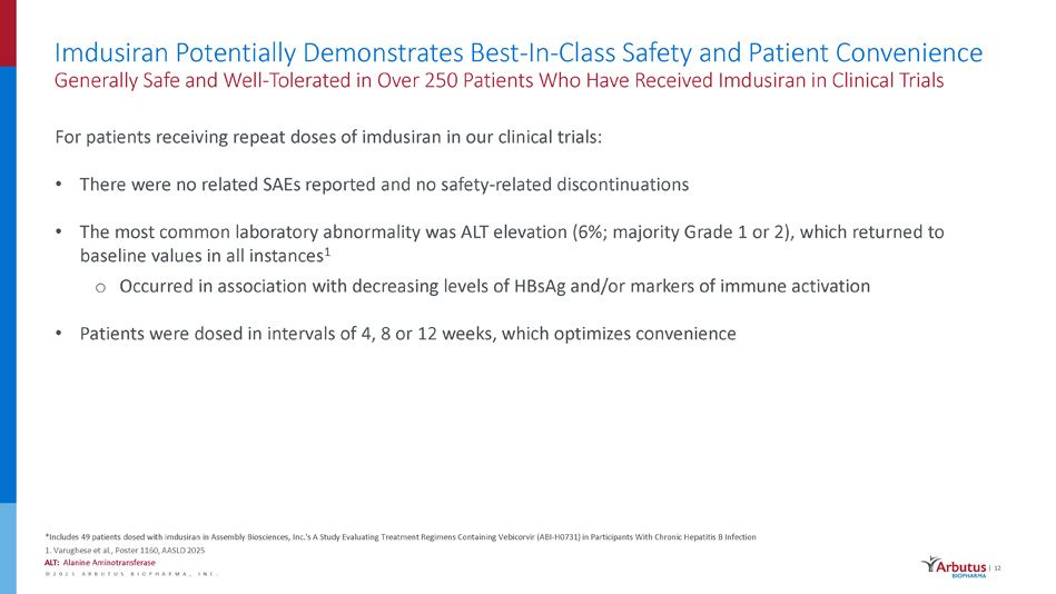 ©2025 ARBUTUS BIOPHARMA, INC . Imdusiran Development Summary | 11 SAD : Single Ascending Dose | MAD : Multiple ascending dose | HBeAg : Hepatitis B e - Antigen Key Outcomes Arms Population Evaluable Patients Phase Study • Single dose imdusiran was safe and well - tolerated in healthy volunteers SAD imdusiran at 60, 180, and 360 mg Healthy Volunteers 12 1a AB - 729 - 001 • SAD and MAD imdusiran well - tolerated in cHBV patients • Similar HBsAg decrease across various dosing intervals • 71% (44/62) of patients achieved HBsAg levels <100 IU/mL (from baseline HBsAg levels between 261 - 19,017 IU/mL (mean: 1,318 IU/mL) • 5% (3/62) of patients achieved HBsAg seroclearance (from baseline HBsAg levels between 545 - 600 IU/mL (mean: 576 IU/mL) SAD 60, 90, 180 mg (n=21); MAD 60 mg Q4 or Q8 weeks (n=14) or MAD 90 mg Q8 or Q12 weeks (n=27) x 40 weeks HBeAg positive/negative cHBV patients with baseline HBsAg levels from 261 - 25,345 IU/mL (mean: 1,977 IU/mL) 62 1b • 6 patients achieved functional cure 1 • Select key data from 12 patients in Cohort A1: ▪ 50% (3/6) of patients with baseline HBsAg <1000 IU/mL achieved functional cure ▪ Overall, 25% (3/12) of patients achieved functional cure • Additionally, a total of 10 patients who did not achieve a functional cure were able to discontinue and remain off NA therapy (from baseline HBsAg levels between 487 - 4,545 IU/mL (mean: 923 IU/mL ) 60 mg Q8 weeks for 24 weeks  1 or 2 doses imdusiran plus PEG - IFN α x 12 weeks (n=25) or x24 weeks (n=18) Virally suppressed HBeAg negative cHBV patients with baseline HBsAg levels from 48 - 5,109 IU/mL (mean: 962 IU/mL) 43 2a IM - PROVE I • 2 patients achieved functional cure 2 • Select key data from 13 patients in Cohort C (VTP - 300 + low - dose nivolumab): ▪ 25% (2/8) of patients with baseline HBsAg <1000 IU/mL achieved functional cure • Additionally, a total of 30 patients who did not achieve a functional cure were able to discontinue and remain off NA therapy (from baseline HBsAg levels between 93 - 3,200 IU/mL (mean: 493 IU/mL) 60 mg Q8 weeks x24 weeks  VTP - 300/placebo (n=40) or 60 mg Q8 weeks x24 weeks  VTP - 300 + low dose nivolumab (n=22) HBeAg positive/negative cHBV patients with baseline HBsAg levels from 93 - 4,000 IU/mL (mean: 696 IU/mL) 62 2a IM - PROVE II 1. Yuen MF et al., Poster THU - 260, EASL 2025; 2. Wong G et al., Poster LBP - 020, EASL 2025