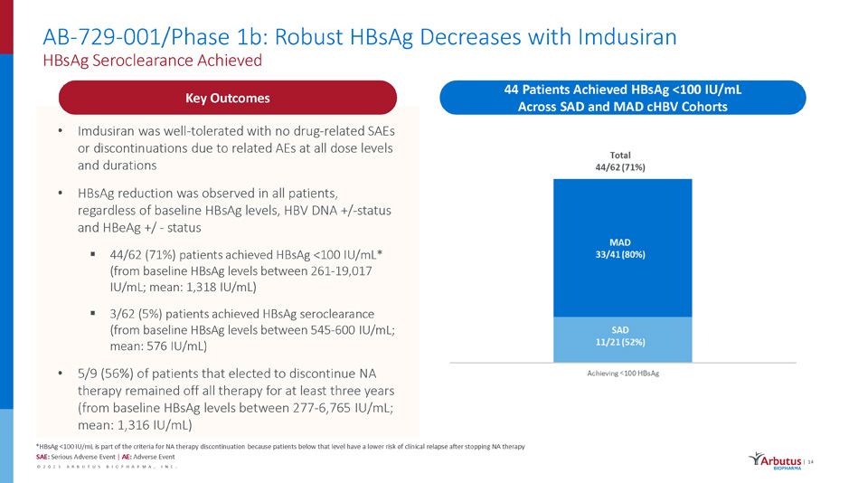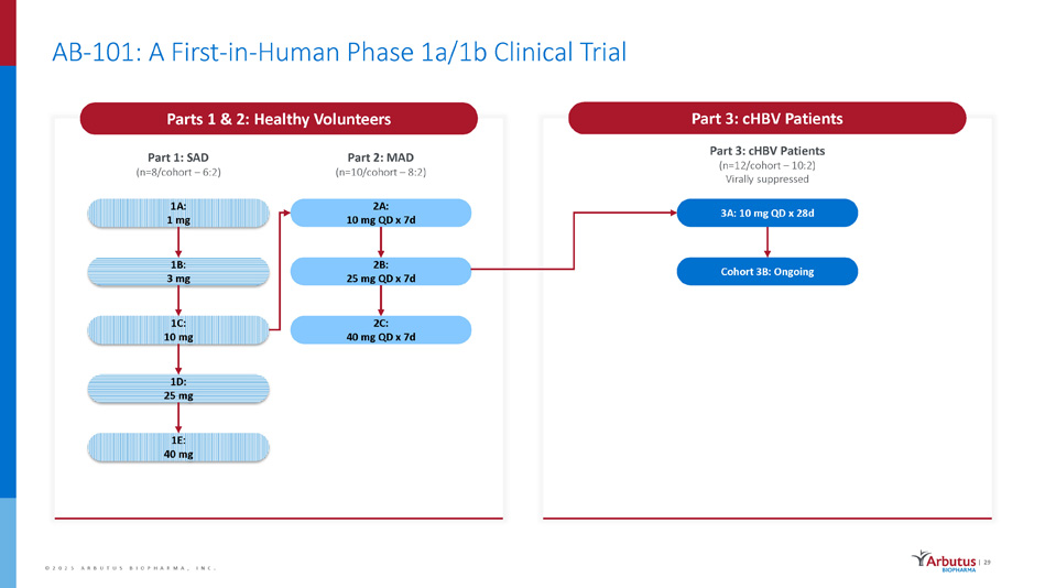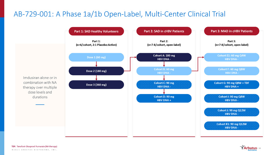 ©2025 ARBUTUS BIOPHARMA, INC . AB - 729 - 001: A Phase 1a/1b Open - Label, Multi - Center Clinical Trial | 13 Imdusiran alone or in combination with NA therapy over multiple dose levels and durations Part 1: SAD Healthy Volunteers Part 2: SAD in cHBV Patients Part 3: MAD in cHBV Patients Part 1: (n=6/cohort, 2:1 P lacebo :Active) Part 2: (n=7 - 8/cohort, open - label) Part 3: (n=7 - 8/cohort, open - label) Dose 1 (60 mg) Dose 2 (180 mg) Dose 3 (360 mg) Cohort A: 180 mg HBV DNA - Cohort B: 60 mg HBV DNA - Cohort C: 90 mg HBV DNA - Cohort D: 90 mg HBV DNA + Cohort E1: 60 mg Q4W HBV DNA - Cohort F: 60 mg Q8W HBV DNA - Cohort G: 90 mg Q8W + TDF HBV DNA + Cohort I: 90 mg Q8W HBV DNA - Cohort J: 90 mg Q12W HBV DNA - Cohort K1: 90 mg Q12W HBV DNA - TDF: Tenofovir Disoproxil Fumarate (NA therapy)