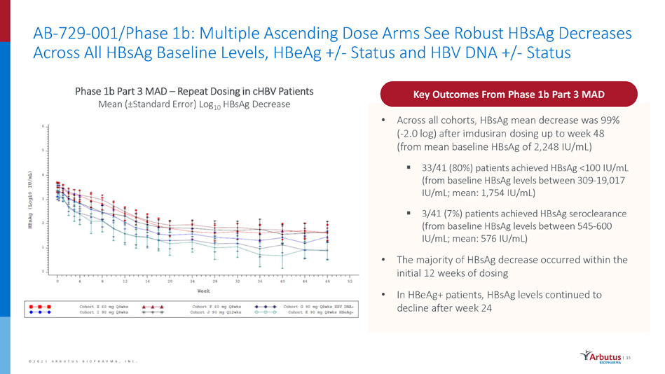 ©2025 ARBUTUS BIOPHARMA, INC . AB - 729 - 001/Phase 1b: Robust HBsAg Decreases with Imdusiran HBsAg Seroclearance Achieved ​ | 14 Key Outcomes • Imdusiran was well - tolerated with no drug - related SAEs or discontinuations due to related AEs at all dose levels and durations • HBsAg reduction was observed in all patients, regardless of baseline HBsAg levels, HBV DNA +/ - status and HBeAg +/ - status ▪ 44/62 (71%) patients achieved HBsAg <100 IU/mL* (from baseline HBsAg levels between 261 - 19,017 IU/mL; mean: 1,318 IU/mL) ▪ 3/62 (5%) patients achieved HBsAg seroclearance (from baseline HBsAg levels between 545 - 600 IU/mL; mean: 576 IU/mL) • 5/9 (56%) of patients that elected to discontinue NA therapy remained off all therapy for at least three years (from baseline HBsAg levels between 277 - 6,765 IU/mL; mean: 1,316 IU/mL) 44 Patients Achieved HBsAg <100 IU/mL Across SAD and MAD cHBV Cohorts SAE : Serious Adverse Event | AE : Adverse Event *HBsAg <100 IU/mL is part of the criteria for NA therapy discontinuation because patients below that level have a lower risk of clinical relapse after stopping NA therapy