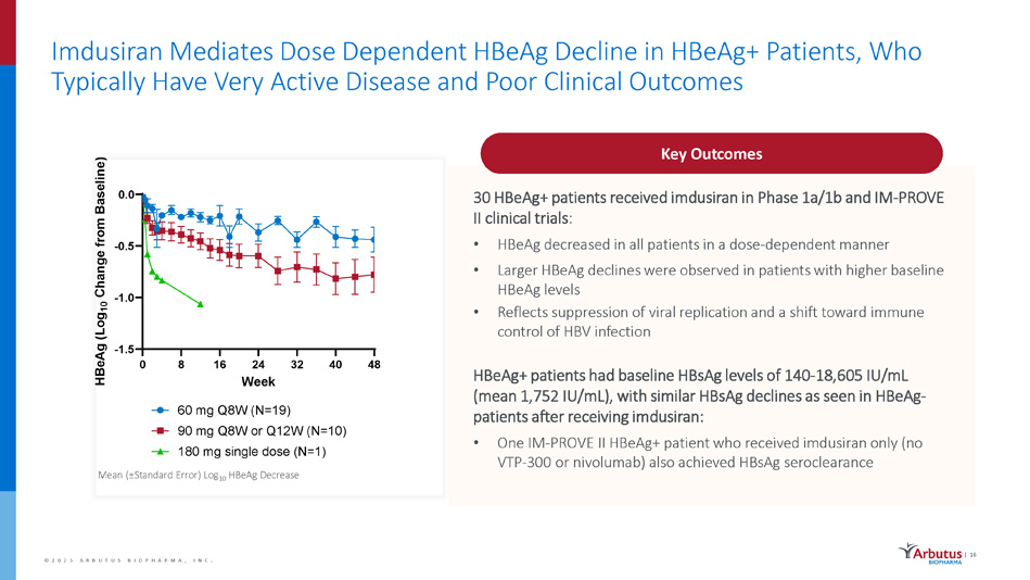 ©2025 ARBUTUS BIOPHARMA, INC . AB - 729 - 001/Phase 1b: Multiple Ascending Dose Arms See Robust HBsAg Decreases Across All HBsAg Baseline Levels, HBeAg +/ - Status and HBV DNA +/ - Status ​ | 15 Phase 1b Part 3 MAD – Repeat Dosing in cHBV Patients Mean ( ± Standard Error) Log 10 HBsAg Decrease • Across all cohorts, HBsAg mean decrease was 99% ( - 2.0 log) after imdusiran dosing up to week 48 (from mean baseline HBsAg of 2,248 IU/mL) ▪ 33/41 (80%) patients achieved HBsAg <100 IU/mL (from baseline HBsAg levels between 309 - 19,017 IU/mL; mean: 1,754 IU/mL) ▪ 3/41 (7%) patients achieved HBsAg seroclearance (from baseline HBsAg levels between 545 - 600 IU/mL; mean: 576 IU/mL) • The majority of HBsAg decrease occurred within the initial 12 weeks of dosing • In HBeAg+ patients, HBsAg levels continued to decline after week 24 Key Outcomes From Phase 1b Part 3 MAD