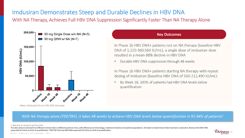 ©2025 ARBUTUS BIOPHARMA, INC . Imdusiran Mediates Dose Dependent HBeAg Decline in HBeAg+ Patients, Who Typically Have Very Active Disease and Poor Clinical Outcomes | 16 Key Outcomes 30 HBeAg+ patients received imdusiran in Phase 1a/1b and IM - PROVE II clinical trials : • HBeAg decreased in all patients in a dose - dependent manner • Larger HBeAg declines were observed in patients with higher baseline HBeAg levels • Reflects suppression of viral replication and a shift toward immune control of HBV infection HBeAg+ patients had baseline HBsAg levels of 140 - 18,605 IU/mL (mean 1,752 IU/mL), with similar HBsAg declines as seen in HBeAg - patients after receiving imdusiran : • One IM - PROVE II HBeAg+ patient who received imdusiran only (no VTP - 300 or nivolumab) also achieved HBsAg seroclearance Mean ( ± Standard Error) Log 10 HBeAg Decrease 0 8 16 24 32 40 48 -1.5 -1.0 -0.5 0.0 WeekH B e A g ( L o g 1 0 C h a n g e f r o m B a s e l i n e ) 60 mg Q8W (N=19) 90 mg Q8W or Q12W (N=10) 180 mg single dose (N=1)