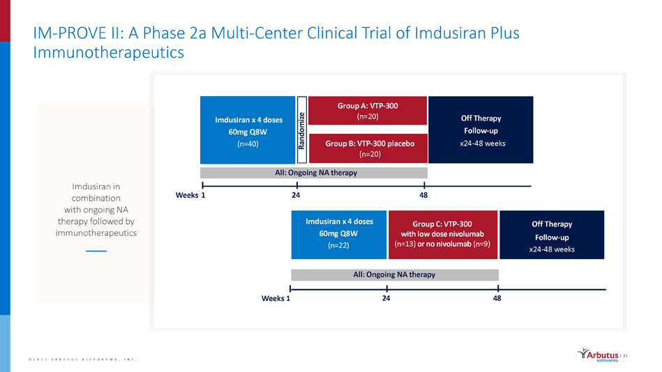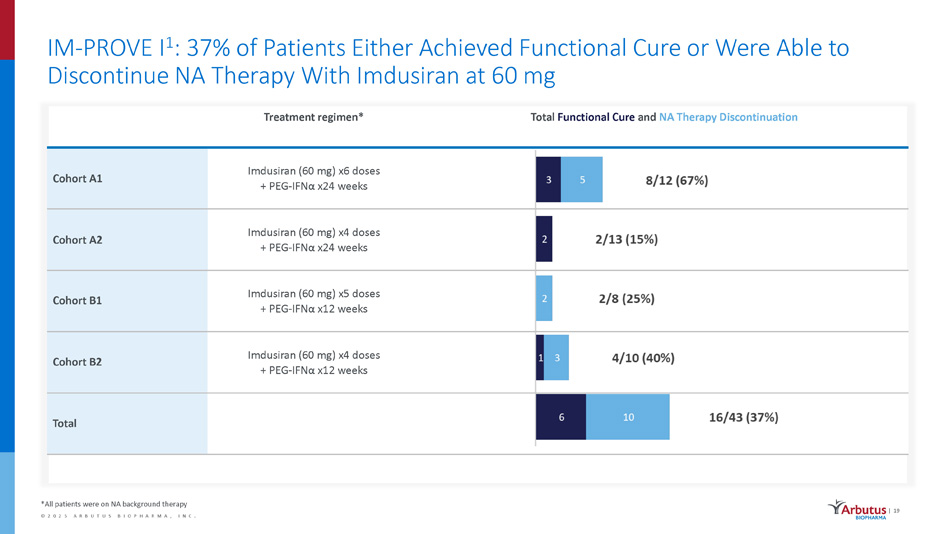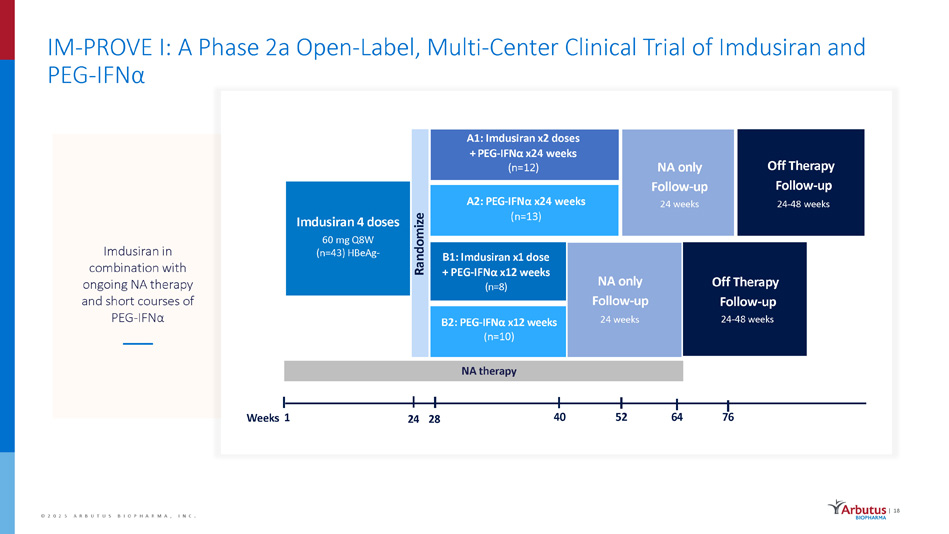 ©2025 ARBUTUS BIOPHARMA, INC . IM - PROVE I: A Phase 2a Open - Label, Multi - Center Clinical Trial of Imdusiran and PEG - IFNα | 18 Imdusiran in combination with ongoing NA therapy and short courses of PEG - IFNα NA only Follow - up 24 weeks A1: Imdusiran x 2 doses + PEG - IFN α x24 w eeks (n=12) A2: PEG - IFN α x24 weeks (n=13) B1: Imdusiran x 1 dose + PEG - IFN α x12 weeks (n=8) Imdusiran 4 doses 60 mg Q8W ( n=43 ) HBeAg - Randomize NA only Follow - up 24 weeks Off Therapy Follow - up 24 - 48 weeks Off Therapy Follow - up 24 - 48 weeks 52 Weeks 1 40 64 76 24 28 B2: PEG - IFN α x12 weeks ( n=10) NA therapy