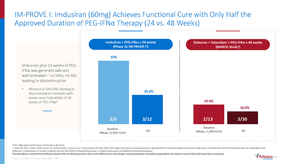 ©2025 ARBUTUS BIOPHARMA, INC . IM - PROVE I 1 : 37% of Patients Either Achieved Functional Cure or Were Able to Discontinue NA Therapy With Imdusiran at 60 mg | 19 *All patients were on NA background therapy Total Functional Cure and NA Therapy Discontinuation Treatment regimen* Imdusiran (60 mg) x6 doses + PEG - IFN α x24 weeks Cohort A1 Imdusiran (60 mg) x4 doses + PEG - IFN α x24 weeks Cohort A2 Imdusiran (60 mg) x5 doses + PEG - IFN α x12 weeks Cohort B1 Imdusiran (60 mg) x4 doses + PEG - IFN α x12 weeks Cohort B2 Total