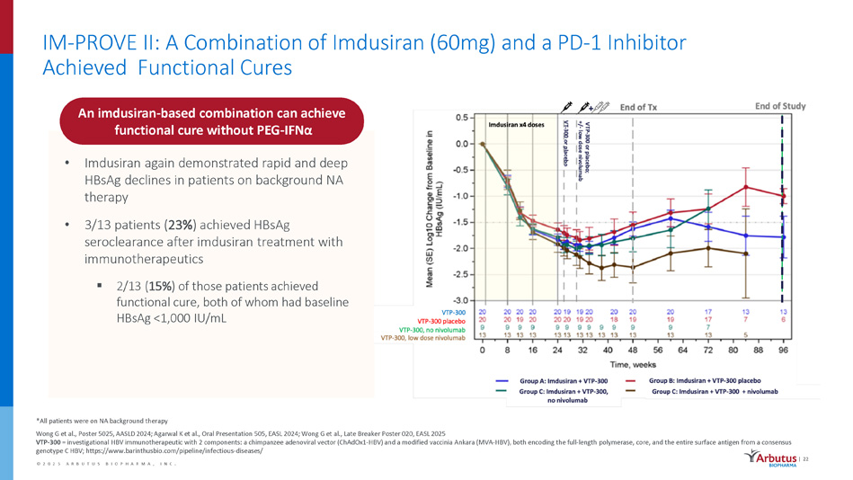 ©2025 ARBUTUS BIOPHARMA, INC . IM - PROVE II: A Phase 2a Multi - Center Clinical Trial of Imdusiran Plus Immunotherapeutics | 21 Imdusiran in combination with ongoing NA therapy followed by immunotherapeutics Group B : VTP - 300 placebo (n=20) Weeks 1 Imdusiran x 4 doses 60mg Q8W (n=40) Imdusiran x 4 doses 6 0 mg Q8W (n=22) Weeks 1 24 Off Therapy Follow - up x24 - 48 weeks Randomize All: Ongoing NA therapy All: Ongoing NA therapy 24 48 48 Off Therapy Follow - up x24 - 48 weeks Group A : VTP - 300 (n=20) Group C: VTP - 300 with low dose nivolumab (n=13) or no nivolumab (n=9)
