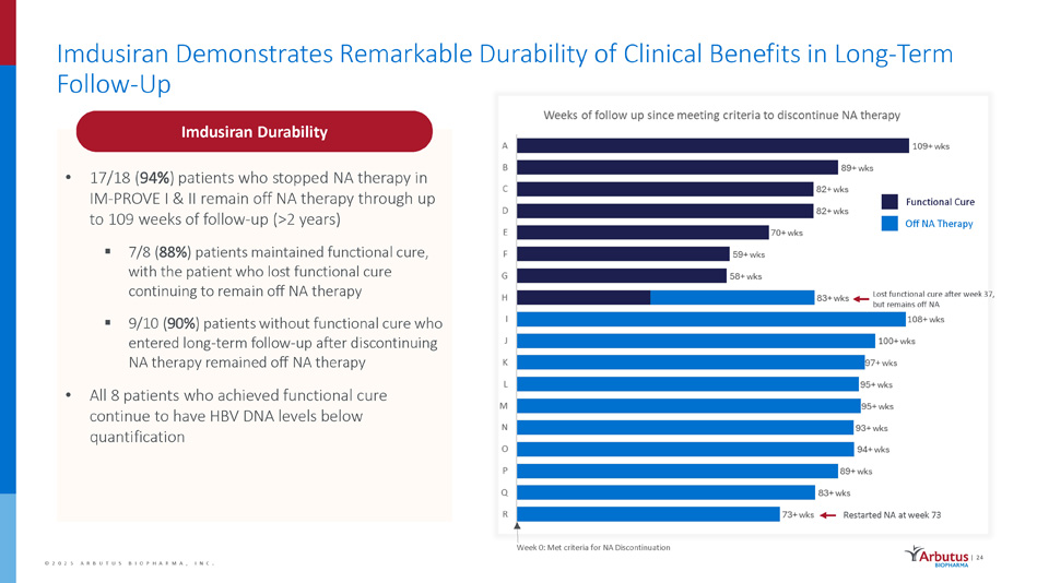 ©2025 ARBUTUS BIOPHARMA, INC . | 23 *All patients were on NA background therapy Total Functional Cure and NA Therapy Discontinuation (48 weeks) Treatment regimen* Imdusiran ( 60mg) x4 doses + VTP - 300 Group A Imdusiran ( 60mg) x4 doses + Placebo Group B Imdusiran ( 60mg) x4 doses + VTP - 300 + No Nivolumab Group C Imdusiran ( 60mg) x4 doses + VTP - 300 + Low - dose Nivolumab Total IM - PROVE II: 52% of Patients Either Achieved Functional Cure or Were Able to Discontinue NA Therapy With Imdusiran at 60 mg 30% of patients treated with imdusiran alone (Group B) were able to discontinue NA therapy after just 4 doses of imdusiran