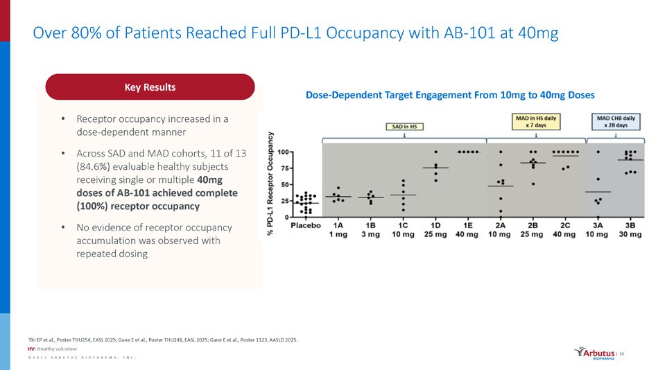 ©2025 ARBUTUS BIOPHARMA, INC . Over 80% of Patients Reached Full PD - L1 Occupancy with AB - 101 at 40mg | 30 Thi EP et al., Poster THU254, EASL 2025; Gane E et al., Poster THU248, EASL 2025; Gane E et al., Poster 1123, AASLD 2025. HV: Healthy volunteer Dose - Dependent Target Engagement From 10mg to 40mg Doses Key Results • Receptor occupancy increased in a dose - dependent manner • Across SAD and MAD cohorts, 11 of 13 (84.6%) evaluable healthy subjects receiving single or multiple 40mg doses of AB - 101 achieved complete (100%) receptor occupancy • No evidence of receptor occupancy accumulation was observed with repeated dosing
