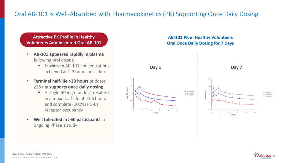 ©2025 ARBUTUS BIOPHARMA, INC . Oral AB - 101 is Well - Absorbed with Pharmacokinetics (PK) Supporting Once Daily Dosing | 31 AB - 101 PK in Healthy Volunteers Oral Once Daily Dosing for 7 Days Attractive PK Profile in Healthy Volunteers Administered Oral AB - 101 • AB - 101 appeared rapidly in plasma following oral dosing ▪ Maximum AB - 101 concentrations achieved at 1 - 3 hours post - dose • Terminal half - life >20 hours at doses ≥25 mg supports once - daily dosing ▪ A single 40 mg oral dose resulted in a mean half - life of 21.6 hours and complete (100%) PD - L1 receptor occupancy • Well tolerated in >50 participants in ongoing Phase ථ 1 study Gane E et al., Poster THU248 , EASL 2025 Day 1 Day 7