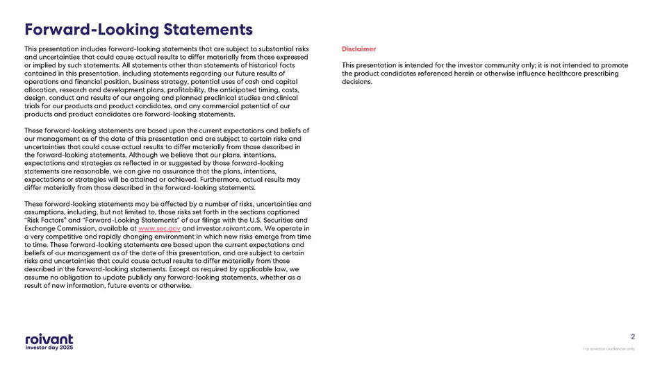 For investor audiences only Forward - Looking Statements This presentation includes forward - looking statements that are subject to substantial risks and uncertainties that could cause actual results to differ materially from those expressed or implied by such statements. All statements other than statements of historical facts contained in this presentation, including statements regarding our future results of operations and financial position, business strategy, potential uses of cash and capital allocation, research and development plans, profitability, the anticipated timing, costs, design, conduct and results of our ongoing and planned preclinical studies and clinical trials for our products and product candidates, and any commercial potential of our products and product candidates are forward - looking statements. These forward - looking statements are based upon the current expectations and beliefs of our management as of the date of this presentation and are subject to certain risks and uncertainties that could cause actual results to differ materially from those described in the forward - looking statements. Although we believe that our plans, intentions, expectations and strategies as reflected in or suggested by those forward - looking statements are reasonable, we can give no assurance that the plans, intentions, expectations or strategies will be attained or achieved. Furthermore, actual results may differ materially from those described in the forward - looking statements. These forward - looking statements may be affected by a number of risks, uncertainties and assumptions, including, but not limited to, those risks set forth in the sections captioned “Risk Factors” and “Forward - Looking Statements” of our filings with the U.S. Securities and Exchange Commission, available at www.sec.gov and investor.roivant.com. We operate in a very competitive and rapidly changing environment in which new risks emerge from time to time. These forward - looking statements are based upon the current expectations and beliefs of our management as of the date of this presentation, and are subject to certain risks and uncertainties that could cause actual results to differ materially from those described in the forward - looking statements. Except as required by applicable law, we assume no obligation to update publicly any forward - looking statements, whether as a result of new information, future events or otherwise. Disclaimer This presentation is intended for the investor community only; it is not intended to promote the product candidates referenced herein or otherwise influence healthcare prescribing decisions. 2