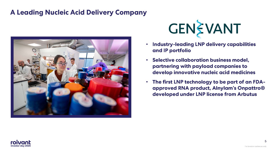 For investor audiences only Genevant and Arbutus Corporate History 2006 Protiva acquired Tekmira, another company working on LNP technology Roivant set out to assemble a leading global HBV company by merging OnCore Biopharma with Protiva/Tekmira to form Arbutus Biopharma Roivant and Arbutus launched Genevant as a joint venture to focus on Arbutus’ LNP and ligand conjugate delivery technologies, with Arbutus’ focus remaining on HBV therapeutics 2008 2015 2018 Protiva and Alnylam (an RNAi developer) published a landmark study in Nature demonstrating the first effective gene silencing in monkeys, using Protiva’s LNP technology 2000 Ian MacLachlan co - founded Protiva, which became a pioneer in LNP technology 4