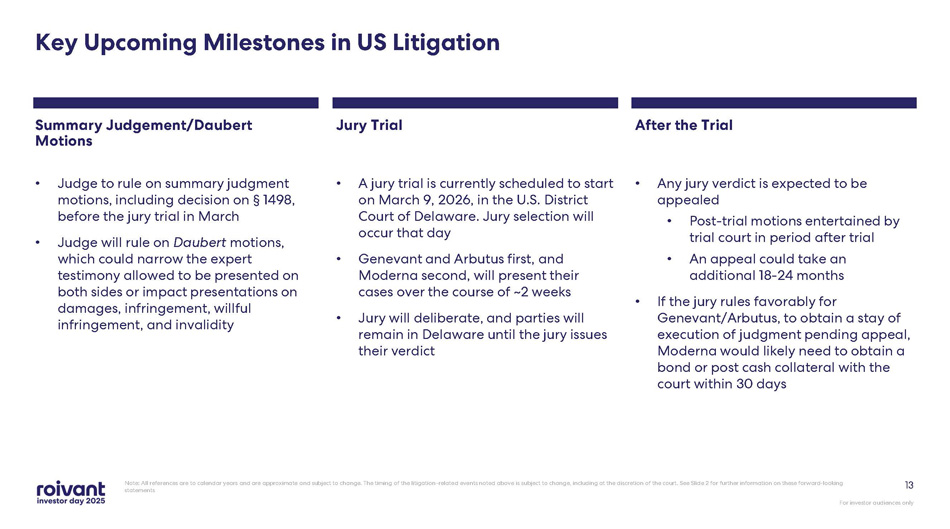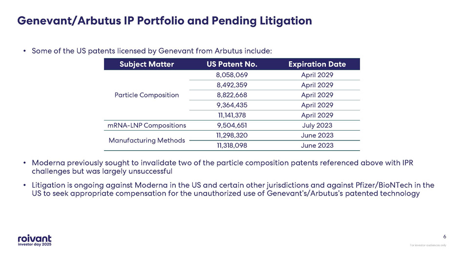 ’s COVID - 19 vaccine (COMIRNATY) infringe multiple Genevant/Arbutus LNP patents In the ex - US Moderna litigation, initial court hearings and rulings are expected in 2026 Markman rulings (claim construction) have been issued in both US cases – viewed by Genevant generally to be favorable Global COVID - 19 vaccine sales since launch have been ~$14 5 BN between Moderna and Pfizer/BioNTech In the US Moderna litigation, a jury trial has been scheduled for March 2026 . Awaiting court scheduling in the Pfizer/BioNTech litigation Key Takeaways: LNP Litigation For investor audiences only