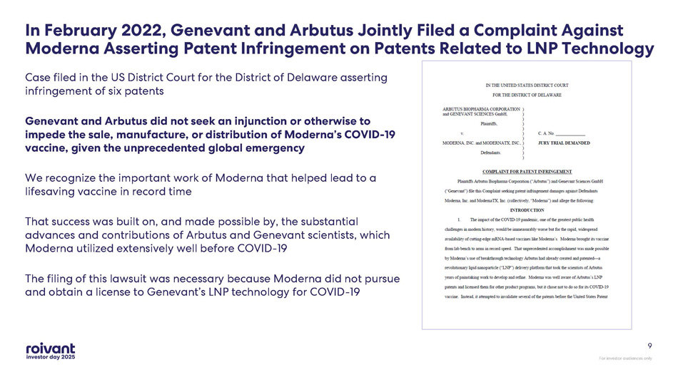 For investor audiences only 9 In February 2022, Genevant and Arbutus Jointly Filed a Complaint Against Moderna Asserting Patent Infringement on Patents Related to LNP Technology Case filed in the US District Court for the District of Delaware asserting infringement of six patents Genevant and Arbutus did not seek an injunction or otherwise to impede the sale, manufacture, or distribution of Moderna’s COVID - 19 vaccine, given the unprecedented global emergency We recognize the important work of Moderna that helped lead to a lifesaving vaccine in record time That success was built on, and made possible by, the substantial advances and contributions of Arbutus and Genevant scientists, which Moderna utilized extensively well before COVID - 19 The filing of this lawsuit was necessary because Moderna did not pursue and obtain a license to Genevant’s LNP technology for COVID - 19