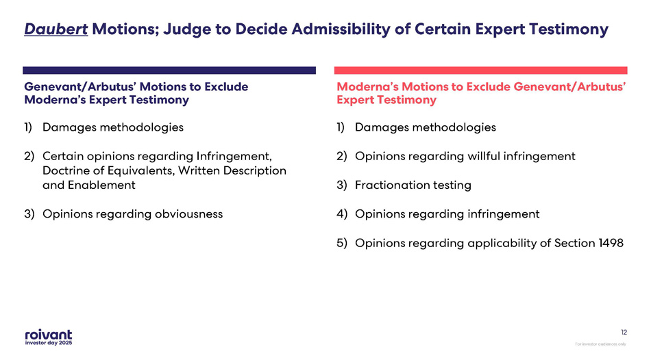 For investor audiences only 11 Summary Judgment Motions Filed in US Moderna Case Note: All references are to calendar years and are approximate and subject to change. The timing of the litigation - related event s noted above is subject to change, including at the discretion of the court. See Slide 2 for further information on these fo rwa rd - looking statements Genevant and Arbutus Filed 5 Motions for Summary Judgment 1. Moderna cannot relitigate obviousness arguments against the Lipid Composition Patents (the ’359, ’435, and ’378 patents) already raised in its unsuccessful IPRs and appeals. 2. Moderna cannot argue at trial that the Asserted Patents are invalid because they do not enable someone in the art to practice the inventions without undue experimentation. 3. Arbutus and Genevant did not derive the invention disclosed in the ’651 patent from a much later Moderna invention. 4. 28 U.S.C. § 1498 does not apply (cross motion). 5. Moderna’s indefiniteness arguments fail as a matter of law (cross motion). Moderna Filed 3 Motions for Summary Judgment 1. 28 U.S.C. § 1498 requires Arbutus and Genevant to recover damages for infringement under one government contract from the U.S. government, not Moderna. 2. Plaintiffs’ claims under the doctrine of equivalents are barred by amendments and arguments made to the PTO during patent prosecution, and Arbutus and Genevant should be able to recover for literal infringement only. 3. The asserted claims of the ’651 patent are invalid for indefiniteness with respect to the Court’s construction of the term “fully encapsulated.” Patents Remaining to Be Litigated at Trial (Following Judge’s Order on Claim Narrowing) US Patent No. ​ Subject Matter ​ 8,492,359 ​ Particle Composition ​ 9,364,435 ​ 11,141,378 ​ 9,504,651 ​ mRNA - LNP Compositions ​