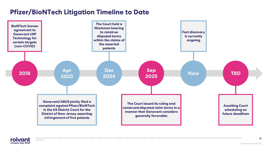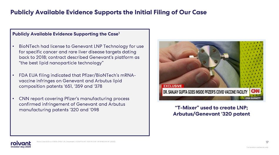 For investor audiences only 16 Pfizer/BioNTech Litigation Timeline to Date Note: All references are to calendar years and are approximate and subject to change. The timing of the litigation - related event s noted above is subject to change, including at the discretion of the court. See Slide 2 for further information on these fo rwa rd - looking statements Awaiting Court scheduling on future deadlines TBD The Court held a Markman hearing to construe disputed terms within the claims of the asserted patents Dec 2024 Now Fact discovery is currently ongoing BioNTech license agreement to Genevant LNP Technology for certain targets (non - COVID) 2018 The Court issued its ruling and construed disputed claim terms in a manner that Genevant considers generally favorable Sep 2025 Genevant/ABUS jointly filed a complaint against Pfizer/BioNTech in the US District Court for the District of New Jersey asserting infringement of five patents Apr 2023