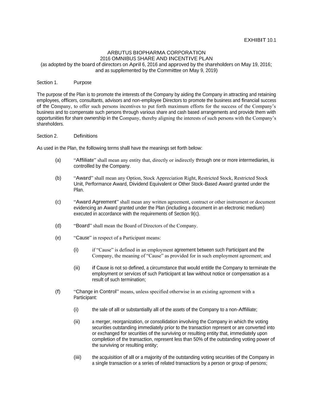 EXHIBIT 10.1 ARBUTUS BIOPHARMA CORPORATION 2016 OMNIBUS SHARE AND INCENTIVE PLAN (as adopted by the board of directors on April 6, 2016 and approved by the shareholders on May 19, 2016; and as supplemented by the Committee on May 9, 2019) Section 1. Purpose The purpose of the Plan is to promote the interests of the Company by aiding the Company in attracting and retaining employees, officers, consultants, advisors and non-employee Directors to promote the business and financial success of the Company, to offer such persons incentives to put forth maximum efforts for the success of the Company’s business and to compensate such persons through various share and cash based arrangements and provide them with opportunities for share ownership in the Company, thereby aligning the interests of such persons with the Company’s shareholders. Section 2. Definitions As used in the Plan, the following terms shall have the meanings set forth below: (a) “Affiliate” shall mean any entity that, directly or indirectly through one or more intermediaries, is controlled by the Company. (b) “Award” shall mean any Option, Stock Appreciation Right, Restricted Stock, Restricted Stock Unit, Performance Award, Dividend Equivalent or Other Stock-Based Award granted under the Plan. (c) “Award Agreement” shall mean any written agreement, contract or other instrument or document evidencing an Award granted under the Plan (including a document in an electronic medium) executed in accordance with the requirements of Section 9(c). (d) “Board” shall mean the Board of Directors of the Company. (e) “Cause” in respect of a Participant means: (i) if “Cause” is defined in an employment agreement between such Participant and the Company, the meaning of “Cause” as provided for in such employment agreement; and (ii) if Cause is not so defined, a circumstance that would entitle the Company to terminate the employment or services of such Participant at law without notice or compensation as a result of such termination; (f) “Change in Control” means, unless specified otherwise in an existing agreement with a Participant: (i) the sale of all or substantially all of the assets of the Company to a non-Affiliate; (ii) a merger, reorganization, or consolidation involving the Company in which the voting securities outstanding immediately prior to the transaction represent or are converted into or exchanged for securities of the surviving or resulting entity that, immediately upon completion of the transaction, represent less than 50% of the outstanding voting power of the surviving or resulting entity; (iii) the acquisition of all or a majority of the outstanding voting securities of the Company in a single transaction or a series of related transactions by a person or group of persons;