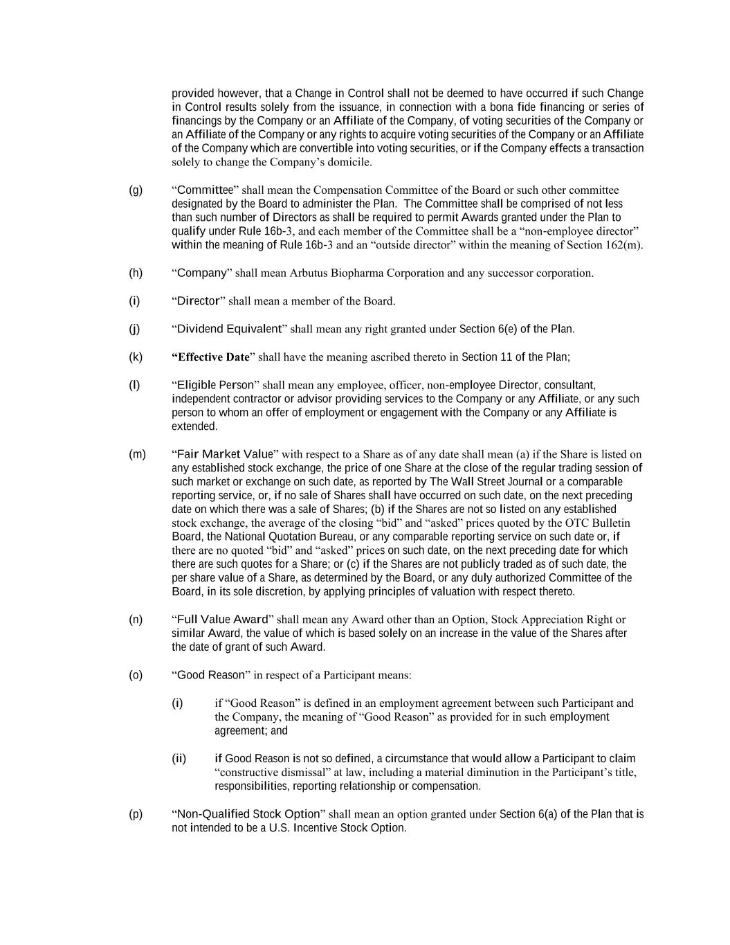 provided however, that a Change in Control shall not be deemed to have occurred if such Change in Control results solely from the issuance, in connection with a bona fide financing or series of financings by the Company or an Affiliate of the Company, of voting securities of the Company or an Affiliate of the Company or any rights to acquire voting securities of the Company or an Affiliate of the Company which are convertible into voting securities, or if the Company effects a transaction solely to change the Company’s domicile. (g) “Committee” shall mean the Compensation Committee of the Board or such other committee designated by the Board to administer the Plan. The Committee shall be comprised of not less than such number of Directors as shall be required to permit Awards granted under the Plan to qualify under Rule 16b-3, and each member of the Committee shall be a “non-employee director” within the meaning of Rule 16b-3 and an “outside director” within the meaning of Section 162(m). (h) “Company” shall mean Arbutus Biopharma Corporation and any successor corporation. (i) “Director” shall mean a member of the Board. (j) “Dividend Equivalent” shall mean any right granted under Section 6(e) of the Plan. (k) “Effective Date” shall have the meaning ascribed thereto in Section 11 of the Plan; (l) “Eligible Person” shall mean any employee, officer, non-employee Director, consultant, independent contractor or advisor providing services to the Company or any Affiliate, or any such person to whom an offer of employment or engagement with the Company or any Affiliate is extended. (m) “Fair Market Value” with respect to a Share as of any date shall mean (a) if the Share is listed on any established stock exchange, the price of one Share at the close of the regular trading session of such market or exchange on such date, as reported by The Wall Street Journal or a comparable reporting service, or, if no sale of Shares shall have occurred on such date, on the next preceding date on which there was a sale of Shares; (b) if the Shares are not so listed on any established stock exchange, the average of the closing “bid” and “asked” prices quoted by the OTC Bulletin Board, the National Quotation Bureau, or any comparable reporting service on such date or, if there are no quoted “bid” and “asked” prices on such date, on the next preceding date for which there are such quotes for a Share; or (c) if the Shares are not publicly traded as of such date, the per share value of a Share, as determined by the Board, or any duly authorized Committee of the Board, in its sole discretion, by applying principles of valuation with respect thereto. (n) “Full Value Award” shall mean any Award other than an Option, Stock Appreciation Right or similar Award, the value of which is based solely on an increase in the value of the Shares after the date of grant of such Award. (o) “Good Reason” in respect of a Participant means: (i) if “Good Reason” is defined in an employment agreement between such Participant and the Company, the meaning of “Good Reason” as provided for in such employment agreement; and (ii) if Good Reason is not so defined, a circumstance that would allow a Participant to claim “constructive dismissal” at law, including a material diminution in the Participant’s title, responsibilities, reporting relationship or compensation. (p) “Non-Qualified Stock Option” shall mean an option granted under Section 6(a) of the Plan that is not intended to be a U.S. Incentive Stock Option.