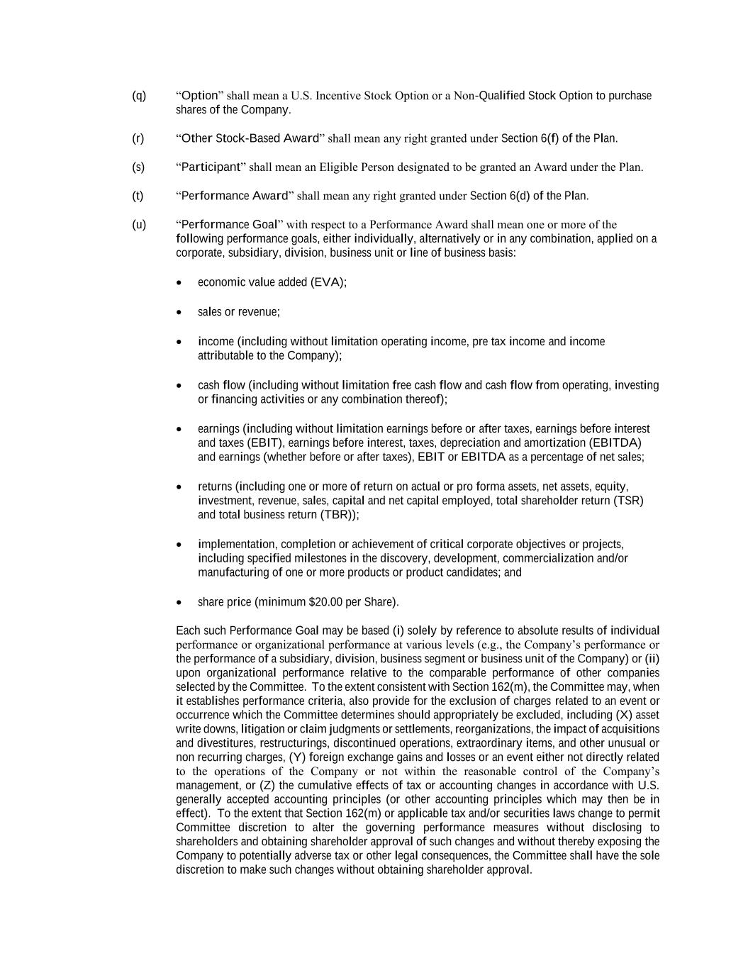 (q) “Option” shall mean a U.S. Incentive Stock Option or a Non-Qualified Stock Option to purchase shares of the Company. (r) “Other Stock-Based Award” shall mean any right granted under Section 6(f) of the Plan. (s) “Participant” shall mean an Eligible Person designated to be granted an Award under the Plan. (t) “Performance Award” shall mean any right granted under Section 6(d) of the Plan. (u) “Performance Goal” with respect to a Performance Award shall mean one or more of the following performance goals, either individually, alternatively or in any combination, applied on a corporate, subsidiary, division, business unit or line of business basis: • economic value added (EVA); • sales or revenue; • income (including without limitation operating income, pre tax income and income attributable to the Company); • cash flow (including without limitation free cash flow and cash flow from operating, investing or financing activities or any combination thereof); • earnings (including without limitation earnings before or after taxes, earnings before interest and taxes (EBIT), earnings before interest, taxes, depreciation and amortization (EBITDA) and earnings (whether before or after taxes), EBIT or EBITDA as a percentage of net sales; • returns (including one or more of return on actual or pro forma assets, net assets, equity, investment, revenue, sales, capital and net capital employed, total shareholder return (TSR) and total business return (TBR)); • implementation, completion or achievement of critical corporate objectives or projects, including specified milestones in the discovery, development, commercialization and/or manufacturing of one or more products or product candidates; and • share price (minimum $20.00 per Share). Each such Performance Goal may be based (i) solely by reference to absolute results of individual performance or organizational performance at various levels (e.g., the Company’s performance or the performance of a subsidiary, division, business segment or business unit of the Company) or (ii) upon organizational performance relative to the comparable performance of other companies selected by the Committee. To the extent consistent with Section 162(m), the Committee may, when it establishes performance criteria, also provide for the exclusion of charges related to an event or occurrence which the Committee determines should appropriately be excluded, including (X) asset write downs, litigation or claim judgments or settlements, reorganizations, the impact of acquisitions and divestitures, restructurings, discontinued operations, extraordinary items, and other unusual or non recurring charges, (Y) foreign exchange gains and losses or an event either not directly related to the operations of the Company or not within the reasonable control of the Company’s management, or (Z) the cumulative effects of tax or accounting changes in accordance with U.S. generally accepted accounting principles (or other accounting principles which may then be in effect). To the extent that Section 162(m) or applicable tax and/or securities laws change to permit Committee discretion to alter the governing performance measures without disclosing to shareholders and obtaining shareholder approval of such changes and without thereby exposing the Company to potentially adverse tax or other legal consequences, the Committee shall have the sole discretion to make such changes without obtaining shareholder approval.