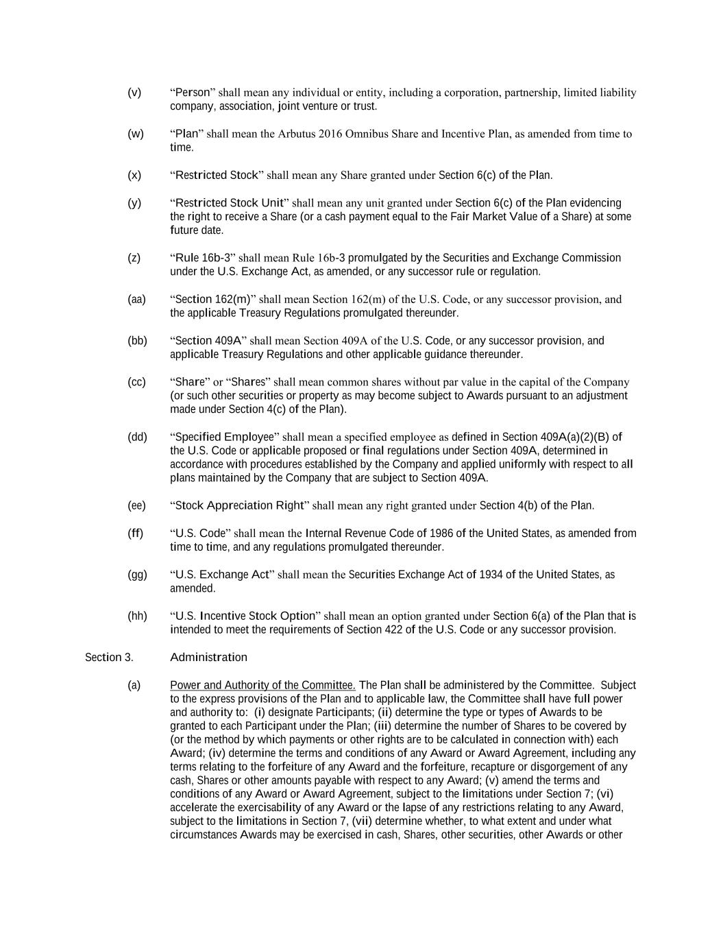 (v) “Person” shall mean any individual or entity, including a corporation, partnership, limited liability company, association, joint venture or trust. (w) “Plan” shall mean the Arbutus 2016 Omnibus Share and Incentive Plan, as amended from time to time. (x) “Restricted Stock” shall mean any Share granted under Section 6(c) of the Plan. (y) “Restricted Stock Unit” shall mean any unit granted under Section 6(c) of the Plan evidencing the right to receive a Share (or a cash payment equal to the Fair Market Value of a Share) at some future date. (z) “Rule 16b-3” shall mean Rule 16b-3 promulgated by the Securities and Exchange Commission under the U.S. Exchange Act, as amended, or any successor rule or regulation. (aa) “Section 162(m)” shall mean Section 162(m) of the U.S. Code, or any successor provision, and the applicable Treasury Regulations promulgated thereunder. (bb) “Section 409A” shall mean Section 409A of the U.S. Code, or any successor provision, and applicable Treasury Regulations and other applicable guidance thereunder. (cc) “Share” or “Shares” shall mean common shares without par value in the capital of the Company (or such other securities or property as may become subject to Awards pursuant to an adjustment made under Section 4(c) of the Plan). (dd) “Specified Employee” shall mean a specified employee as defined in Section 409A(a)(2)(B) of the U.S. Code or applicable proposed or final regulations under Section 409A, determined in accordance with procedures established by the Company and applied uniformly with respect to all plans maintained by the Company that are subject to Section 409A. (ee) “Stock Appreciation Right” shall mean any right granted under Section 4(b) of the Plan. (ff) “U.S. Code” shall mean the Internal Revenue Code of 1986 of the United States, as amended from time to time, and any regulations promulgated thereunder. (gg) “U.S. Exchange Act” shall mean the Securities Exchange Act of 1934 of the United States, as amended. (hh) “U.S. Incentive Stock Option” shall mean an option granted under Section 6(a) of the Plan that is intended to meet the requirements of Section 422 of the U.S. Code or any successor provision. Section 3. Administration (a) Power and Authority of the Committee. The Plan shall be administered by the Committee. Subject to the express provisions of the Plan and to applicable law, the Committee shall have full power and authority to: (i) designate Participants; (ii) determine the type or types of Awards to be granted to each Participant under the Plan; (iii) determine the number of Shares to be covered by (or the method by which payments or other rights are to be calculated in connection with) each Award; (iv) determine the terms and conditions of any Award or Award Agreement, including any terms relating to the forfeiture of any Award and the forfeiture, recapture or disgorgement of any cash, Shares or other amounts payable with respect to any Award; (v) amend the terms and conditions of any Award or Award Agreement, subject to the limitations under Section 7; (vi) accelerate the exercisability of any Award or the lapse of any restrictions relating to any Award, subject to the limitations in Section 7, (vii) determine whether, to what extent and under what circumstances Awards may be exercised in cash, Shares, other securities, other Awards or other