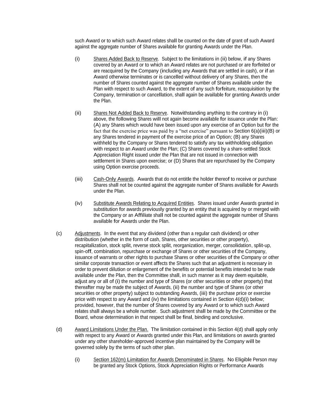 such Award or to which such Award relates shall be counted on the date of grant of such Award against the aggregate number of Shares available for granting Awards under the Plan. (i) Shares Added Back to Reserve. Subject to the limitations in (ii) below, if any Shares covered by an Award or to which an Award relates are not purchased or are forfeited or are reacquired by the Company (including any Awards that are settled in cash), or if an Award otherwise terminates or is cancelled without delivery of any Shares, then the number of Shares counted against the aggregate number of Shares available under the Plan with respect to such Award, to the extent of any such forfeiture, reacquisition by the Company, termination or cancellation, shall again be available for granting Awards under the Plan. (ii) Shares Not Added Back to Reserve. Notwithstanding anything to the contrary in (i) above, the following Shares will not again become available for issuance under the Plan: (A) any Shares which would have been issued upon any exercise of an Option but for the fact that the exercise price was paid by a “net exercise” pursuant to Section 6(a)(iii)(B) or any Shares tendered in payment of the exercise price of an Option; (B) any Shares withheld by the Company or Shares tendered to satisfy any tax withholding obligation with respect to an Award under the Plan; (C) Shares covered by a share-settled Stock Appreciation Right issued under the Plan that are not issued in connection with settlement in Shares upon exercise; or (D) Shares that are repurchased by the Company using Option exercise proceeds. (iii) Cash-Only Awards. Awards that do not entitle the holder thereof to receive or purchase Shares shall not be counted against the aggregate number of Shares available for Awards under the Plan. (iv) Substitute Awards Relating to Acquired Entities. Shares issued under Awards granted in substitution for awards previously granted by an entity that is acquired by or merged with the Company or an Affiliate shall not be counted against the aggregate number of Shares available for Awards under the Plan. (c) Adjustments. In the event that any dividend (other than a regular cash dividend) or other distribution (whether in the form of cash, Shares, other securities or other property), recapitalization, stock split, reverse stock split, reorganization, merger, consolidation, split-up, spin-off, combination, repurchase or exchange of Shares or other securities of the Company, issuance of warrants or other rights to purchase Shares or other securities of the Company or other similar corporate transaction or event affects the Shares such that an adjustment is necessary in order to prevent dilution or enlargement of the benefits or potential benefits intended to be made available under the Plan, then the Committee shall, in such manner as it may deem equitable, adjust any or all of (i) the number and type of Shares (or other securities or other property) that thereafter may be made the subject of Awards, (ii) the number and type of Shares (or other securities or other property) subject to outstanding Awards, (iii) the purchase price or exercise price with respect to any Award and (iv) the limitations contained in Section 4(d)(i) below; provided, however, that the number of Shares covered by any Award or to which such Award relates shall always be a whole number. Such adjustment shall be made by the Committee or the Board, whose determination in that respect shall be final, binding and conclusive. (d) Award Limitations Under the Plan. The limitation contained in this Section 4(d) shall apply only with respect to any Award or Awards granted under this Plan, and limitations on awards granted under any other shareholder-approved incentive plan maintained by the Company will be governed solely by the terms of such other plan. (i) Section 162(m) Limitation for Awards Denominated in Shares. No Eligible Person may be granted any Stock Options, Stock Appreciation Rights or Performance Awards
