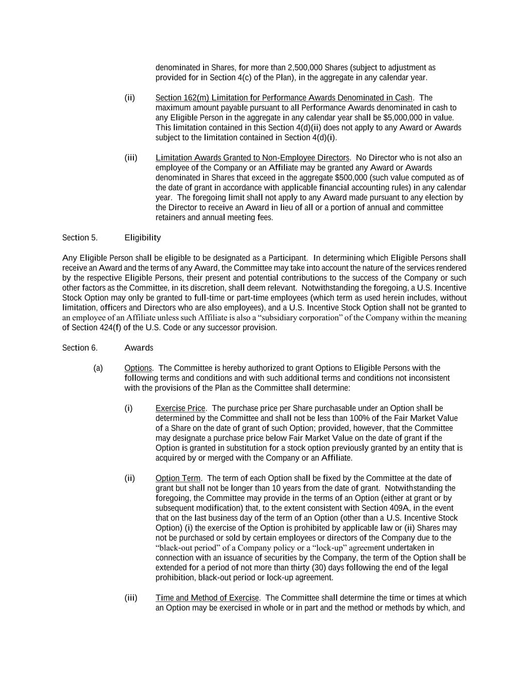denominated in Shares, for more than 2,500,000 Shares (subject to adjustment as provided for in Section 4(c) of the Plan), in the aggregate in any calendar year. (ii) Section 162(m) Limitation for Performance Awards Denominated in Cash. The maximum amount payable pursuant to all Performance Awards denominated in cash to any Eligible Person in the aggregate in any calendar year shall be $5,000,000 in value. This limitation contained in this Section 4(d)(ii) does not apply to any Award or Awards subject to the limitation contained in Section 4(d)(i). (iii) Limitation Awards Granted to Non-Employee Directors. No Director who is not also an employee of the Company or an Affiliate may be granted any Award or Awards denominated in Shares that exceed in the aggregate $500,000 (such value computed as of the date of grant in accordance with applicable financial accounting rules) in any calendar year. The foregoing limit shall not apply to any Award made pursuant to any election by the Director to receive an Award in lieu of all or a portion of annual and committee retainers and annual meeting fees. Section 5. Eligibility Any Eligible Person shall be eligible to be designated as a Participant. In determining which Eligible Persons shall receive an Award and the terms of any Award, the Committee may take into account the nature of the services rendered by the respective Eligible Persons, their present and potential contributions to the success of the Company or such other factors as the Committee, in its discretion, shall deem relevant. Notwithstanding the foregoing, a U.S. Incentive Stock Option may only be granted to full-time or part-time employees (which term as used herein includes, without limitation, officers and Directors who are also employees), and a U.S. Incentive Stock Option shall not be granted to an employee of an Affiliate unless such Affiliate is also a “subsidiary corporation” of the Company within the meaning of Section 424(f) of the U.S. Code or any successor provision. Section 6. Awards (a) Options. The Committee is hereby authorized to grant Options to Eligible Persons with the following terms and conditions and with such additional terms and conditions not inconsistent with the provisions of the Plan as the Committee shall determine: (i) Exercise Price. The purchase price per Share purchasable under an Option shall be determined by the Committee and shall not be less than 100% of the Fair Market Value of a Share on the date of grant of such Option; provided, however, that the Committee may designate a purchase price below Fair Market Value on the date of grant if the Option is granted in substitution for a stock option previously granted by an entity that is acquired by or merged with the Company or an Affiliate. (ii) Option Term. The term of each Option shall be fixed by the Committee at the date of grant but shall not be longer than 10 years from the date of grant. Notwithstanding the foregoing, the Committee may provide in the terms of an Option (either at grant or by subsequent modification) that, to the extent consistent with Section 409A, in the event that on the last business day of the term of an Option (other than a U.S. Incentive Stock Option) (i) the exercise of the Option is prohibited by applicable law or (ii) Shares may not be purchased or sold by certain employees or directors of the Company due to the “black-out period” of a Company policy or a “lock-up” agreement undertaken in connection with an issuance of securities by the Company, the term of the Option shall be extended for a period of not more than thirty (30) days following the end of the legal prohibition, black-out period or lock-up agreement. (iii) Time and Method of Exercise. The Committee shall determine the time or times at which an Option may be exercised in whole or in part and the method or methods by which, and