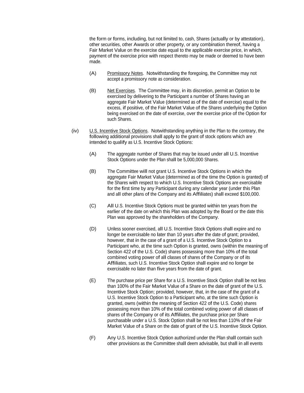 the form or forms, including, but not limited to, cash, Shares (actually or by attestation), other securities, other Awards or other property, or any combination thereof, having a Fair Market Value on the exercise date equal to the applicable exercise price, in which, payment of the exercise price with respect thereto may be made or deemed to have been made. (A) Promissory Notes. Notwithstanding the foregoing, the Committee may not accept a promissory note as consideration. (B) Net Exercises. The Committee may, in its discretion, permit an Option to be exercised by delivering to the Participant a number of Shares having an aggregate Fair Market Value (determined as of the date of exercise) equal to the excess, if positive, of the Fair Market Value of the Shares underlying the Option being exercised on the date of exercise, over the exercise price of the Option for such Shares. (iv) U.S. Incentive Stock Options. Notwithstanding anything in the Plan to the contrary, the following additional provisions shall apply to the grant of stock options which are intended to qualify as U.S. Incentive Stock Options: (A) The aggregate number of Shares that may be issued under all U.S. Incentive Stock Options under the Plan shall be 5,000,000 Shares. (B) The Committee will not grant U.S. Incentive Stock Options in which the aggregate Fair Market Value (determined as of the time the Option is granted) of the Shares with respect to which U.S. Incentive Stock Options are exercisable for the first time by any Participant during any calendar year (under this Plan and all other plans of the Company and its Affiliates) shall exceed $100,000. (C) All U.S. Incentive Stock Options must be granted within ten years from the earlier of the date on which this Plan was adopted by the Board or the date this Plan was approved by the shareholders of the Company. (D) Unless sooner exercised, all U.S. Incentive Stock Options shall expire and no longer be exercisable no later than 10 years after the date of grant; provided, however, that in the case of a grant of a U.S. Incentive Stock Option to a Participant who, at the time such Option is granted, owns (within the meaning of Section 422 of the U.S. Code) shares possessing more than 10% of the total combined voting power of all classes of shares of the Company or of its Affiliates, such U.S. Incentive Stock Option shall expire and no longer be exercisable no later than five years from the date of grant. (E) The purchase price per Share for a U.S. Incentive Stock Option shall be not less than 100% of the Fair Market Value of a Share on the date of grant of the U.S. Incentive Stock Option; provided, however, that, in the case of the grant of a U.S. Incentive Stock Option to a Participant who, at the time such Option is granted, owns (within the meaning of Section 422 of the U.S. Code) shares possessing more than 10% of the total combined voting power of all classes of shares of the Company or of its Affiliates, the purchase price per Share purchasable under a U.S. Stock Option shall be not less than 110% of the Fair Market Value of a Share on the date of grant of the U.S. Incentive Stock Option. (F) Any U.S. Incentive Stock Option authorized under the Plan shall contain such other provisions as the Committee shall deem advisable, but shall in all events