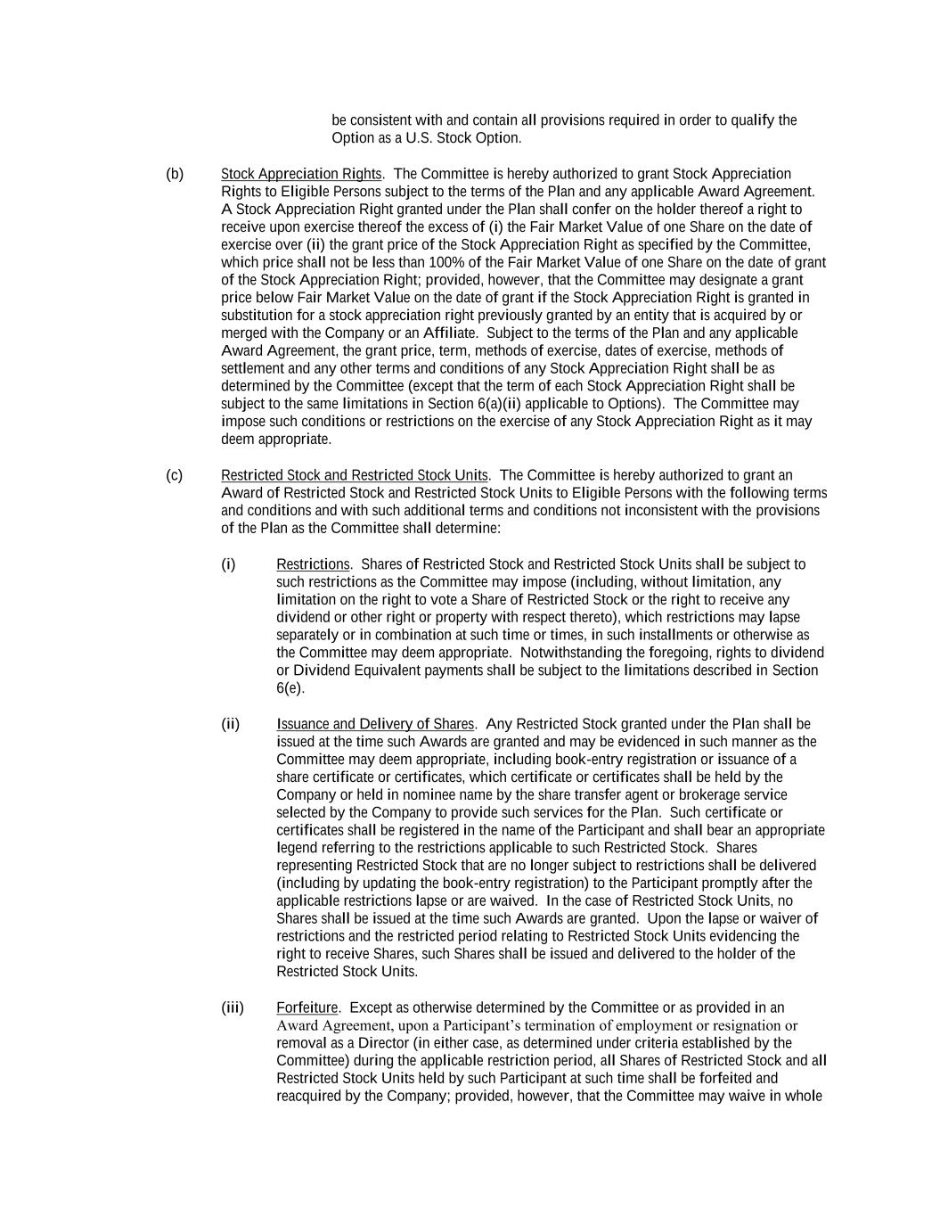 be consistent with and contain all provisions required in order to qualify the Option as a U.S. Stock Option. (b) Stock Appreciation Rights. The Committee is hereby authorized to grant Stock Appreciation Rights to Eligible Persons subject to the terms of the Plan and any applicable Award Agreement. A Stock Appreciation Right granted under the Plan shall confer on the holder thereof a right to receive upon exercise thereof the excess of (i) the Fair Market Value of one Share on the date of exercise over (ii) the grant price of the Stock Appreciation Right as specified by the Committee, which price shall not be less than 100% of the Fair Market Value of one Share on the date of grant of the Stock Appreciation Right; provided, however, that the Committee may designate a grant price below Fair Market Value on the date of grant if the Stock Appreciation Right is granted in substitution for a stock appreciation right previously granted by an entity that is acquired by or merged with the Company or an Affiliate. Subject to the terms of the Plan and any applicable Award Agreement, the grant price, term, methods of exercise, dates of exercise, methods of settlement and any other terms and conditions of any Stock Appreciation Right shall be as determined by the Committee (except that the term of each Stock Appreciation Right shall be subject to the same limitations in Section 6(a)(ii) applicable to Options). The Committee may impose such conditions or restrictions on the exercise of any Stock Appreciation Right as it may deem appropriate. (c) Restricted Stock and Restricted Stock Units. The Committee is hereby authorized to grant an Award of Restricted Stock and Restricted Stock Units to Eligible Persons with the following terms and conditions and with such additional terms and conditions not inconsistent with the provisions of the Plan as the Committee shall determine: (i) Restrictions. Shares of Restricted Stock and Restricted Stock Units shall be subject to such restrictions as the Committee may impose (including, without limitation, any limitation on the right to vote a Share of Restricted Stock or the right to receive any dividend or other right or property with respect thereto), which restrictions may lapse separately or in combination at such time or times, in such installments or otherwise as the Committee may deem appropriate. Notwithstanding the foregoing, rights to dividend or Dividend Equivalent payments shall be subject to the limitations described in Section 6(e). (ii) Issuance and Delivery of Shares. Any Restricted Stock granted under the Plan shall be issued at the time such Awards are granted and may be evidenced in such manner as the Committee may deem appropriate, including book-entry registration or issuance of a share certificate or certificates, which certificate or certificates shall be held by the Company or held in nominee name by the share transfer agent or brokerage service selected by the Company to provide such services for the Plan. Such certificate or certificates shall be registered in the name of the Participant and shall bear an appropriate legend referring to the restrictions applicable to such Restricted Stock. Shares representing Restricted Stock that are no longer subject to restrictions shall be delivered (including by updating the book-entry registration) to the Participant promptly after the applicable restrictions lapse or are waived. In the case of Restricted Stock Units, no Shares shall be issued at the time such Awards are granted. Upon the lapse or waiver of restrictions and the restricted period relating to Restricted Stock Units evidencing the right to receive Shares, such Shares shall be issued and delivered to the holder of the Restricted Stock Units. (iii) Forfeiture. Except as otherwise determined by the Committee or as provided in an Award Agreement, upon a Participant’s termination of employment or resignation or removal as a Director (in either case, as determined under criteria established by the Committee) during the applicable restriction period, all Shares of Restricted Stock and all Restricted Stock Units held by such Participant at such time shall be forfeited and reacquired by the Company; provided, however, that the Committee may waive in whole