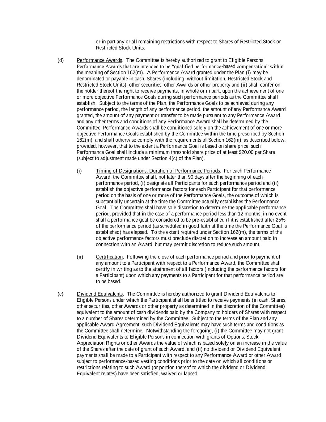 or in part any or all remaining restrictions with respect to Shares of Restricted Stock or Restricted Stock Units. (d) Performance Awards. The Committee is hereby authorized to grant to Eligible Persons Performance Awards that are intended to be “qualified performance-based compensation” within the meaning of Section 162(m). A Performance Award granted under the Plan (i) may be denominated or payable in cash, Shares (including, without limitation, Restricted Stock and Restricted Stock Units), other securities, other Awards or other property and (ii) shall confer on the holder thereof the right to receive payments, in whole or in part, upon the achievement of one or more objective Performance Goals during such performance periods as the Committee shall establish. Subject to the terms of the Plan, the Performance Goals to be achieved during any performance period, the length of any performance period, the amount of any Performance Award granted, the amount of any payment or transfer to be made pursuant to any Performance Award and any other terms and conditions of any Performance Award shall be determined by the Committee. Performance Awards shall be conditioned solely on the achievement of one or more objective Performance Goals established by the Committee within the time prescribed by Section 162(m), and shall otherwise comply with the requirements of Section 162(m), as described below; provided, however, that to the extent a Performance Goal is based on share price, such Performance Goal shall include a minimum threshold share price of at least $20.00 per Share (subject to adjustment made under Section 4(c) of the Plan). (i) Timing of Designations; Duration of Performance Periods. For each Performance Award, the Committee shall, not later than 90 days after the beginning of each performance period, (i) designate all Participants for such performance period and (ii) establish the objective performance factors for each Participant for that performance period on the basis of one or more of the Performance Goals, the outcome of which is substantially uncertain at the time the Committee actually establishes the Performance Goal. The Committee shall have sole discretion to determine the applicable performance period, provided that in the case of a performance period less than 12 months, in no event shall a performance goal be considered to be pre-established if it is established after 25% of the performance period (as scheduled in good faith at the time the Performance Goal is established) has elapsed. To the extent required under Section 162(m), the terms of the objective performance factors must preclude discretion to increase an amount paid in connection with an Award, but may permit discretion to reduce such amount. (ii) Certification. Following the close of each performance period and prior to payment of any amount to a Participant with respect to a Performance Award, the Committee shall certify in writing as to the attainment of all factors (including the performance factors for a Participant) upon which any payments to a Participant for that performance period are to be based. (e) Dividend Equivalents. The Committee is hereby authorized to grant Dividend Equivalents to Eligible Persons under which the Participant shall be entitled to receive payments (in cash, Shares, other securities, other Awards or other property as determined in the discretion of the Committee) equivalent to the amount of cash dividends paid by the Company to holders of Shares with respect to a number of Shares determined by the Committee. Subject to the terms of the Plan and any applicable Award Agreement, such Dividend Equivalents may have such terms and conditions as the Committee shall determine. Notwithstanding the foregoing, (i) the Committee may not grant Dividend Equivalents to Eligible Persons in connection with grants of Options, Stock Appreciation Rights or other Awards the value of which is based solely on an increase in the value of the Shares after the date of grant of such Award, and (ii) no dividend or Dividend Equivalent payments shall be made to a Participant with respect to any Performance Award or other Award subject to performance-based vesting conditions prior to the date on which all conditions or restrictions relating to such Award (or portion thereof to which the dividend or Dividend Equivalent relates) have been satisfied, waived or lapsed.
