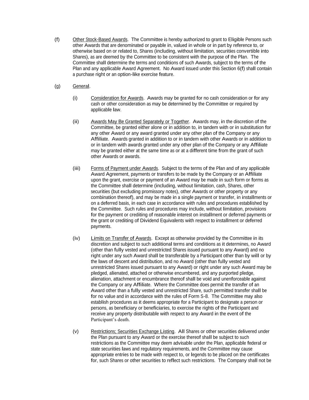 (f) Other Stock-Based Awards. The Committee is hereby authorized to grant to Eligible Persons such other Awards that are denominated or payable in, valued in whole or in part by reference to, or otherwise based on or related to, Shares (including, without limitation, securities convertible into Shares), as are deemed by the Committee to be consistent with the purpose of the Plan. The Committee shall determine the terms and conditions of such Awards, subject to the terms of the Plan and any applicable Award Agreement. No Award issued under this Section 6(f) shall contain a purchase right or an option-like exercise feature. (g) General. (i) Consideration for Awards. Awards may be granted for no cash consideration or for any cash or other consideration as may be determined by the Committee or required by applicable law. (ii) Awards May Be Granted Separately or Together. Awards may, in the discretion of the Committee, be granted either alone or in addition to, in tandem with or in substitution for any other Award or any award granted under any other plan of the Company or any Affiliate. Awards granted in addition to or in tandem with other Awards or in addition to or in tandem with awards granted under any other plan of the Company or any Affiliate may be granted either at the same time as or at a different time from the grant of such other Awards or awards. (iii) Forms of Payment under Awards. Subject to the terms of the Plan and of any applicable Award Agreement, payments or transfers to be made by the Company or an Affiliate upon the grant, exercise or payment of an Award may be made in such form or forms as the Committee shall determine (including, without limitation, cash, Shares, other securities (but excluding promissory notes), other Awards or other property or any combination thereof), and may be made in a single payment or transfer, in installments or on a deferred basis, in each case in accordance with rules and procedures established by the Committee. Such rules and procedures may include, without limitation, provisions for the payment or crediting of reasonable interest on installment or deferred payments or the grant or crediting of Dividend Equivalents with respect to installment or deferred payments. (iv) Limits on Transfer of Awards. Except as otherwise provided by the Committee in its discretion and subject to such additional terms and conditions as it determines, no Award (other than fully vested and unrestricted Shares issued pursuant to any Award) and no right under any such Award shall be transferable by a Participant other than by will or by the laws of descent and distribution, and no Award (other than fully vested and unrestricted Shares issued pursuant to any Award) or right under any such Award may be pledged, alienated, attached or otherwise encumbered, and any purported pledge, alienation, attachment or encumbrance thereof shall be void and unenforceable against the Company or any Affiliate. Where the Committee does permit the transfer of an Award other than a fully vested and unrestricted Share, such permitted transfer shall be for no value and in accordance with the rules of Form S-8. The Committee may also establish procedures as it deems appropriate for a Participant to designate a person or persons, as beneficiary or beneficiaries, to exercise the rights of the Participant and receive any property distributable with respect to any Award in the event of the Participant’s death. (v) Restrictions; Securities Exchange Listing. All Shares or other securities delivered under the Plan pursuant to any Award or the exercise thereof shall be subject to such restrictions as the Committee may deem advisable under the Plan, applicable federal or state securities laws and regulatory requirements, and the Committee may cause appropriate entries to be made with respect to, or legends to be placed on the certificates for, such Shares or other securities to reflect such restrictions. The Company shall not be