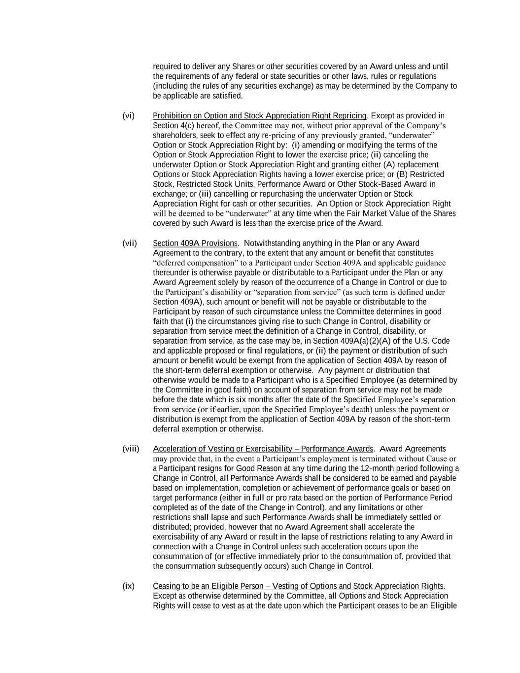 required to deliver any Shares or other securities covered by an Award unless and until the requirements of any federal or state securities or other laws, rules or regulations (including the rules of any securities exchange) as may be determined by the Company to be applicable are satisfied. (vi) Prohibition on Option and Stock Appreciation Right Repricing. Except as provided in Section 4(c) hereof, the Committee may not, without prior approval of the Company’s shareholders, seek to effect any re-pricing of any previously granted, “underwater” Option or Stock Appreciation Right by: (i) amending or modifying the terms of the Option or Stock Appreciation Right to lower the exercise price; (ii) canceling the underwater Option or Stock Appreciation Right and granting either (A) replacement Options or Stock Appreciation Rights having a lower exercise price; or (B) Restricted Stock, Restricted Stock Units, Performance Award or Other Stock-Based Award in exchange; or (iii) cancelling or repurchasing the underwater Option or Stock Appreciation Right for cash or other securities. An Option or Stock Appreciation Right will be deemed to be “underwater” at any time when the Fair Market Value of the Shares covered by such Award is less than the exercise price of the Award. (vii) Section 409A Provisions. Notwithstanding anything in the Plan or any Award Agreement to the contrary, to the extent that any amount or benefit that constitutes “deferred compensation” to a Participant under Section 409A and applicable guidance thereunder is otherwise payable or distributable to a Participant under the Plan or any Award Agreement solely by reason of the occurrence of a Change in Control or due to the Participant’s disability or “separation from service” (as such term is defined under Section 409A), such amount or benefit will not be payable or distributable to the Participant by reason of such circumstance unless the Committee determines in good faith that (i) the circumstances giving rise to such Change in Control, disability or separation from service meet the definition of a Change in Control, disability, or separation from service, as the case may be, in Section 409A(a)(2)(A) of the U.S. Code and applicable proposed or final regulations, or (ii) the payment or distribution of such amount or benefit would be exempt from the application of Section 409A by reason of the short-term deferral exemption or otherwise. Any payment or distribution that otherwise would be made to a Participant who is a Specified Employee (as determined by the Committee in good faith) on account of separation from service may not be made before the date which is six months after the date of the Specified Employee’s separation from service (or if earlier, upon the Specified Employee’s death) unless the payment or distribution is exempt from the application of Section 409A by reason of the short-term deferral exemption or otherwise. (viii) Acceleration of Vesting or Exercisability – Performance Awards. Award Agreements may provide that, in the event a Participant’s employment is terminated without Cause or a Participant resigns for Good Reason at any time during the 12-month period following a Change in Control, all Performance Awards shall be considered to be earned and payable based on implementation, completion or achievement of performance goals or based on target performance (either in full or pro rata based on the portion of Performance Period completed as of the date of the Change in Control), and any limitations or other restrictions shall lapse and such Performance Awards shall be immediately settled or distributed; provided, however that no Award Agreement shall accelerate the exercisability of any Award or result in the lapse of restrictions relating to any Award in connection with a Change in Control unless such acceleration occurs upon the consummation of (or effective immediately prior to the consummation of, provided that the consummation subsequently occurs) such Change in Control. (ix) Ceasing to be an Eligible Person – Vesting of Options and Stock Appreciation Rights. Except as otherwise determined by the Committee, all Options and Stock Appreciation Rights will cease to vest as at the date upon which the Participant ceases to be an Eligible