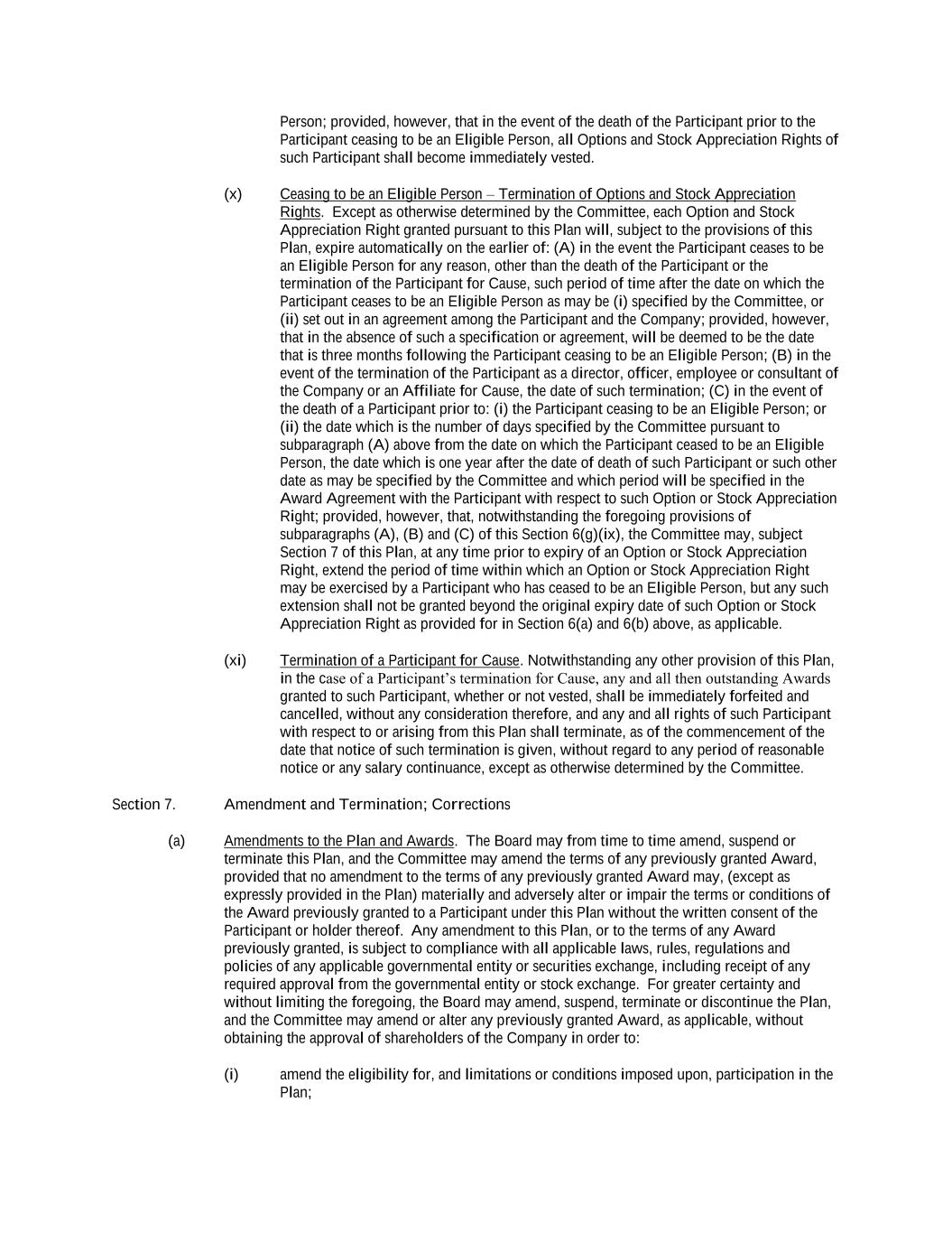 Person; provided, however, that in the event of the death of the Participant prior to the Participant ceasing to be an Eligible Person, all Options and Stock Appreciation Rights of such Participant shall become immediately vested. (x) Ceasing to be an Eligible Person – Termination of Options and Stock Appreciation Rights. Except as otherwise determined by the Committee, each Option and Stock Appreciation Right granted pursuant to this Plan will, subject to the provisions of this Plan, expire automatically on the earlier of: (A) in the event the Participant ceases to be an Eligible Person for any reason, other than the death of the Participant or the termination of the Participant for Cause, such period of time after the date on which the Participant ceases to be an Eligible Person as may be (i) specified by the Committee, or (ii) set out in an agreement among the Participant and the Company; provided, however, that in the absence of such a specification or agreement, will be deemed to be the date that is three months following the Participant ceasing to be an Eligible Person; (B) in the event of the termination of the Participant as a director, officer, employee or consultant of the Company or an Affiliate for Cause, the date of such termination; (C) in the event of the death of a Participant prior to: (i) the Participant ceasing to be an Eligible Person; or (ii) the date which is the number of days specified by the Committee pursuant to subparagraph (A) above from the date on which the Participant ceased to be an Eligible Person, the date which is one year after the date of death of such Participant or such other date as may be specified by the Committee and which period will be specified in the Award Agreement with the Participant with respect to such Option or Stock Appreciation Right; provided, however, that, notwithstanding the foregoing provisions of subparagraphs (A), (B) and (C) of this Section 6(g)(ix), the Committee may, subject Section 7 of this Plan, at any time prior to expiry of an Option or Stock Appreciation Right, extend the period of time within which an Option or Stock Appreciation Right may be exercised by a Participant who has ceased to be an Eligible Person, but any such extension shall not be granted beyond the original expiry date of such Option or Stock Appreciation Right as provided for in Section 6(a) and 6(b) above, as applicable. (xi) Termination of a Participant for Cause. Notwithstanding any other provision of this Plan, in the case of a Participant’s termination for Cause, any and all then outstanding Awards granted to such Participant, whether or not vested, shall be immediately forfeited and cancelled, without any consideration therefore, and any and all rights of such Participant with respect to or arising from this Plan shall terminate, as of the commencement of the date that notice of such termination is given, without regard to any period of reasonable notice or any salary continuance, except as otherwise determined by the Committee. Section 7. Amendment and Termination; Corrections (a) Amendments to the Plan and Awards. The Board may from time to time amend, suspend or terminate this Plan, and the Committee may amend the terms of any previously granted Award, provided that no amendment to the terms of any previously granted Award may, (except as expressly provided in the Plan) materially and adversely alter or impair the terms or conditions of the Award previously granted to a Participant under this Plan without the written consent of the Participant or holder thereof. Any amendment to this Plan, or to the terms of any Award previously granted, is subject to compliance with all applicable laws, rules, regulations and policies of any applicable governmental entity or securities exchange, including receipt of any required approval from the governmental entity or stock exchange. For greater certainty and without limiting the foregoing, the Board may amend, suspend, terminate or discontinue the Plan, and the Committee may amend or alter any previously granted Award, as applicable, without obtaining the approval of shareholders of the Company in order to: (i) amend the eligibility for, and limitations or conditions imposed upon, participation in the Plan;