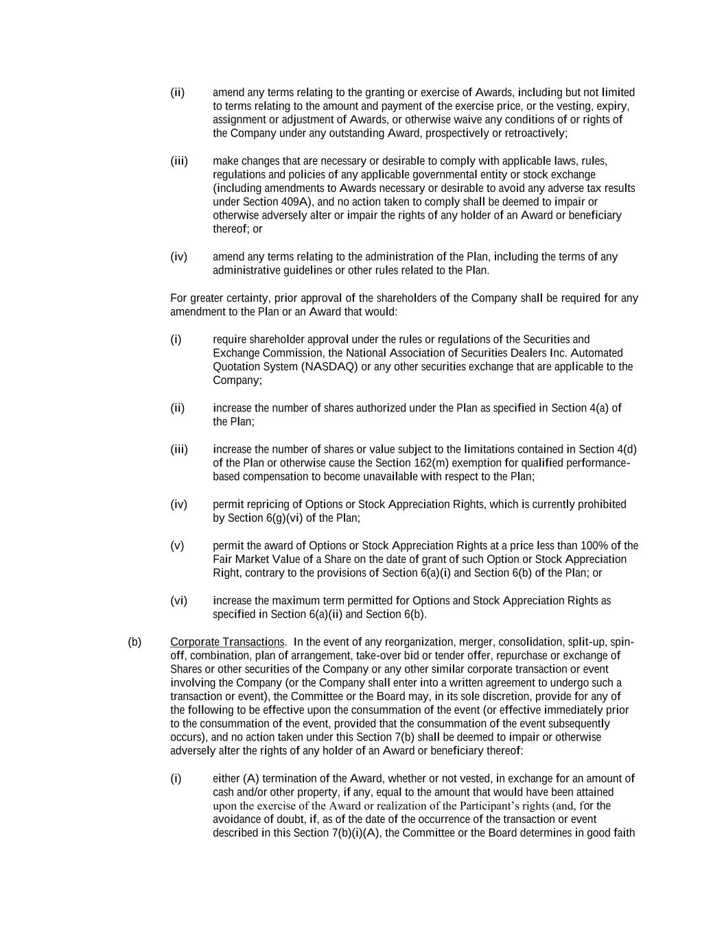 (ii) amend any terms relating to the granting or exercise of Awards, including but not limited to terms relating to the amount and payment of the exercise price, or the vesting, expiry, assignment or adjustment of Awards, or otherwise waive any conditions of or rights of the Company under any outstanding Award, prospectively or retroactively; (iii) make changes that are necessary or desirable to comply with applicable laws, rules, regulations and policies of any applicable governmental entity or stock exchange (including amendments to Awards necessary or desirable to avoid any adverse tax results under Section 409A), and no action taken to comply shall be deemed to impair or otherwise adversely alter or impair the rights of any holder of an Award or beneficiary thereof; or (iv) amend any terms relating to the administration of the Plan, including the terms of any administrative guidelines or other rules related to the Plan. For greater certainty, prior approval of the shareholders of the Company shall be required for any amendment to the Plan or an Award that would: (i) require shareholder approval under the rules or regulations of the Securities and Exchange Commission, the National Association of Securities Dealers Inc. Automated Quotation System (NASDAQ) or any other securities exchange that are applicable to the Company; (ii) increase the number of shares authorized under the Plan as specified in Section 4(a) of the Plan; (iii) increase the number of shares or value subject to the limitations contained in Section 4(d) of the Plan or otherwise cause the Section 162(m) exemption for qualified performance- based compensation to become unavailable with respect to the Plan; (iv) permit repricing of Options or Stock Appreciation Rights, which is currently prohibited by Section 6(g)(vi) of the Plan; (v) permit the award of Options or Stock Appreciation Rights at a price less than 100% of the Fair Market Value of a Share on the date of grant of such Option or Stock Appreciation Right, contrary to the provisions of Section 6(a)(i) and Section 6(b) of the Plan; or (vi) increase the maximum term permitted for Options and Stock Appreciation Rights as specified in Section 6(a)(ii) and Section 6(b). (b) Corporate Transactions. In the event of any reorganization, merger, consolidation, split-up, spin- off, combination, plan of arrangement, take-over bid or tender offer, repurchase or exchange of Shares or other securities of the Company or any other similar corporate transaction or event involving the Company (or the Company shall enter into a written agreement to undergo such a transaction or event), the Committee or the Board may, in its sole discretion, provide for any of the following to be effective upon the consummation of the event (or effective immediately prior to the consummation of the event, provided that the consummation of the event subsequently occurs), and no action taken under this Section 7(b) shall be deemed to impair or otherwise adversely alter the rights of any holder of an Award or beneficiary thereof: (i) either (A) termination of the Award, whether or not vested, in exchange for an amount of cash and/or other property, if any, equal to the amount that would have been attained upon the exercise of the Award or realization of the Participant’s rights (and, for the avoidance of doubt, if, as of the date of the occurrence of the transaction or event described in this Section 7(b)(i)(A), the Committee or the Board determines in good faith