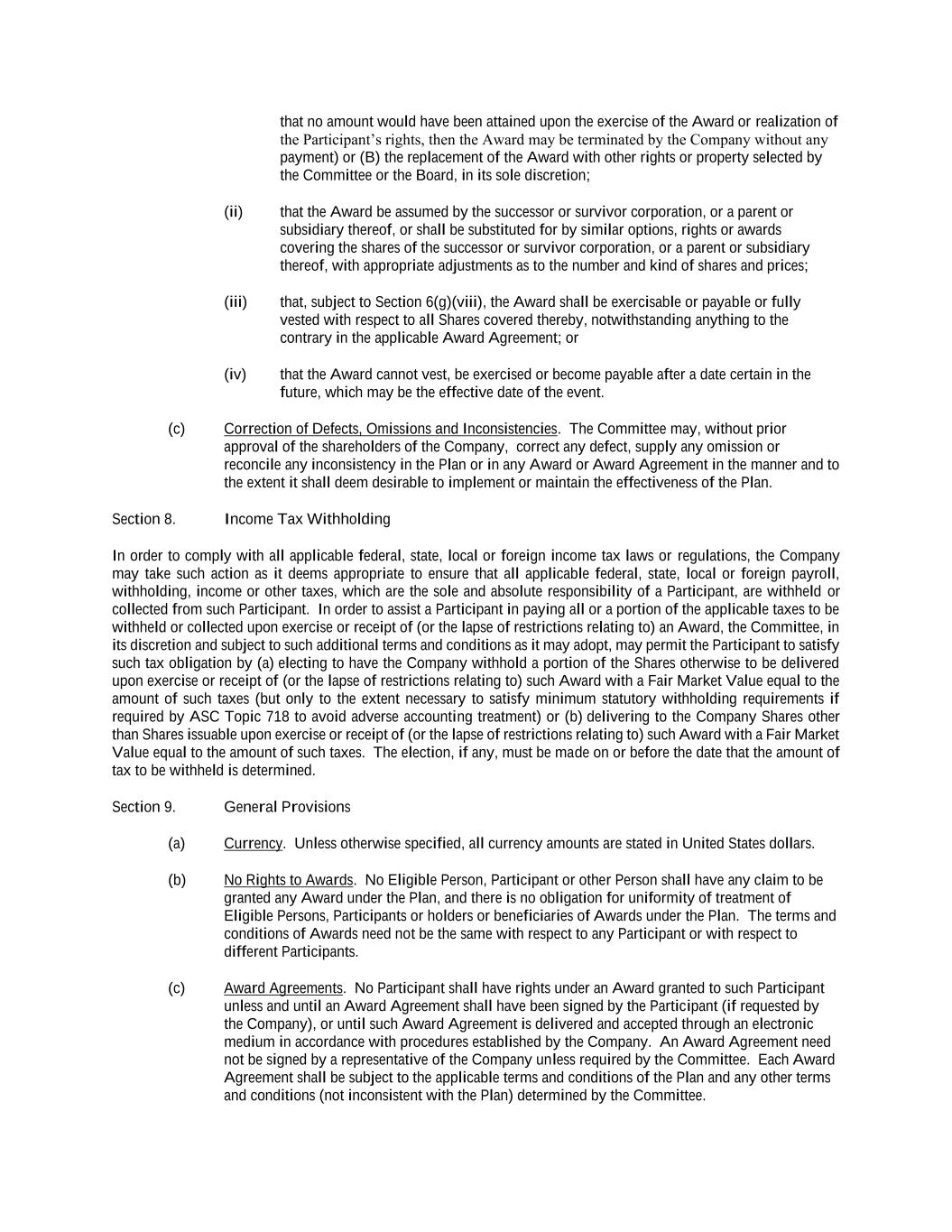 that no amount would have been attained upon the exercise of the Award or realization of the Participant’s rights, then the Award may be terminated by the Company without any payment) or (B) the replacement of the Award with other rights or property selected by the Committee or the Board, in its sole discretion; (ii) that the Award be assumed by the successor or survivor corporation, or a parent or subsidiary thereof, or shall be substituted for by similar options, rights or awards covering the shares of the successor or survivor corporation, or a parent or subsidiary thereof, with appropriate adjustments as to the number and kind of shares and prices; (iii) that, subject to Section 6(g)(viii), the Award shall be exercisable or payable or fully vested with respect to all Shares covered thereby, notwithstanding anything to the contrary in the applicable Award Agreement; or (iv) that the Award cannot vest, be exercised or become payable after a date certain in the future, which may be the effective date of the event. (c) Correction of Defects, Omissions and Inconsistencies. The Committee may, without prior approval of the shareholders of the Company, correct any defect, supply any omission or reconcile any inconsistency in the Plan or in any Award or Award Agreement in the manner and to the extent it shall deem desirable to implement or maintain the effectiveness of the Plan. Section 8. Income Tax Withholding In order to comply with all applicable federal, state, local or foreign income tax laws or regulations, the Company may take such action as it deems appropriate to ensure that all applicable federal, state, local or foreign payroll, withholding, income or other taxes, which are the sole and absolute responsibility of a Participant, are withheld or collected from such Participant. In order to assist a Participant in paying all or a portion of the applicable taxes to be withheld or collected upon exercise or receipt of (or the lapse of restrictions relating to) an Award, the Committee, in its discretion and subject to such additional terms and conditions as it may adopt, may permit the Participant to satisfy such tax obligation by (a) electing to have the Company withhold a portion of the Shares otherwise to be delivered upon exercise or receipt of (or the lapse of restrictions relating to) such Award with a Fair Market Value equal to the amount of such taxes (but only to the extent necessary to satisfy minimum statutory withholding requirements if required by ASC Topic 718 to avoid adverse accounting treatment) or (b) delivering to the Company Shares other than Shares issuable upon exercise or receipt of (or the lapse of restrictions relating to) such Award with a Fair Market Value equal to the amount of such taxes. The election, if any, must be made on or before the date that the amount of tax to be withheld is determined. Section 9. General Provisions (a) Currency. Unless otherwise specified, all currency amounts are stated in United States dollars. (b) No Rights to Awards. No Eligible Person, Participant or other Person shall have any claim to be granted any Award under the Plan, and there is no obligation for uniformity of treatment of Eligible Persons, Participants or holders or beneficiaries of Awards under the Plan. The terms and conditions of Awards need not be the same with respect to any Participant or with respect to different Participants. (c) Award Agreements. No Participant shall have rights under an Award granted to such Participant unless and until an Award Agreement shall have been signed by the Participant (if requested by the Company), or until such Award Agreement is delivered and accepted through an electronic medium in accordance with procedures established by the Company. An Award Agreement need not be signed by a representative of the Company unless required by the Committee. Each Award Agreement shall be subject to the applicable terms and conditions of the Plan and any other terms and conditions (not inconsistent with the Plan) determined by the Committee.