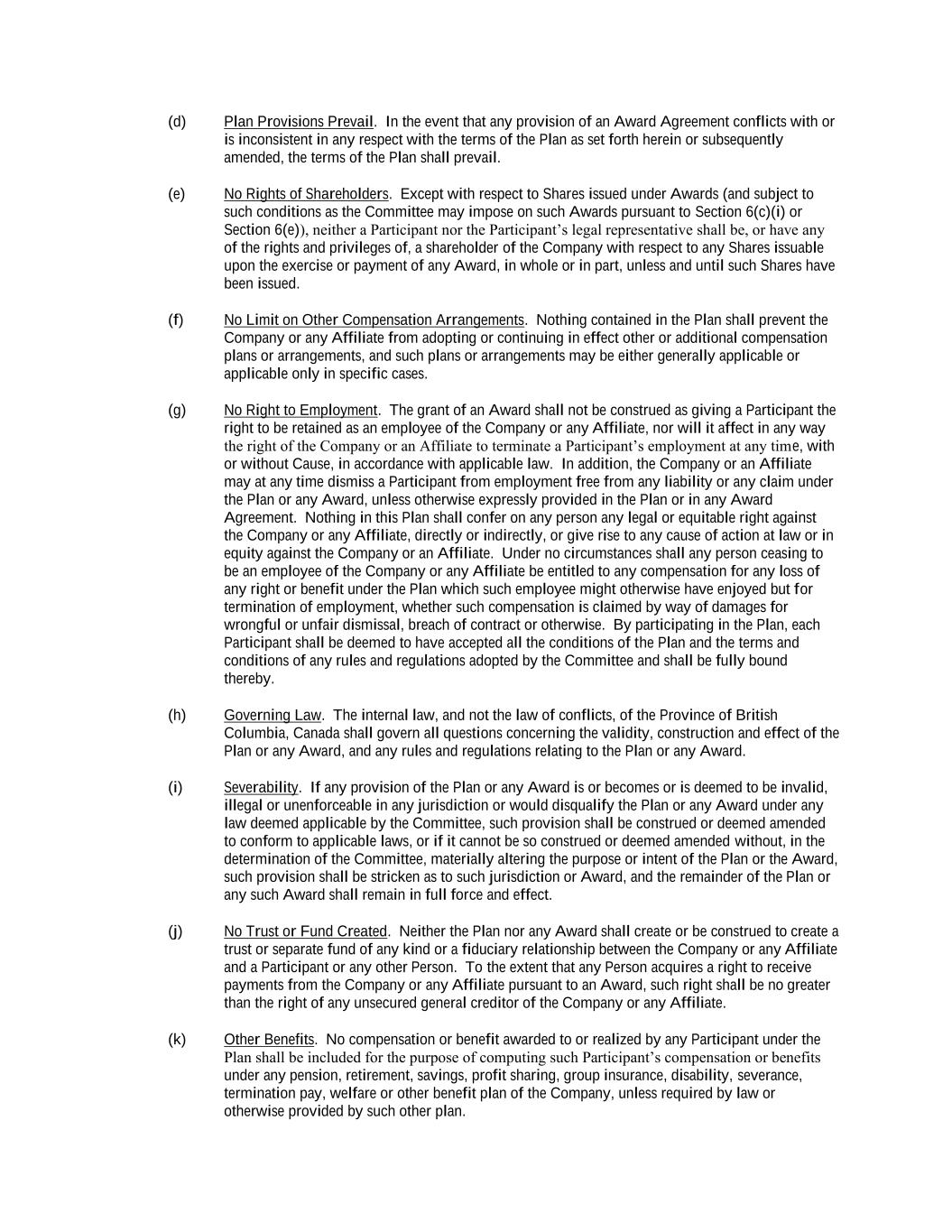(d) Plan Provisions Prevail. In the event that any provision of an Award Agreement conflicts with or is inconsistent in any respect with the terms of the Plan as set forth herein or subsequently amended, the terms of the Plan shall prevail. (e) No Rights of Shareholders. Except with respect to Shares issued under Awards (and subject to such conditions as the Committee may impose on such Awards pursuant to Section 6(c)(i) or Section 6(e)), neither a Participant nor the Participant’s legal representative shall be, or have any of the rights and privileges of, a shareholder of the Company with respect to any Shares issuable upon the exercise or payment of any Award, in whole or in part, unless and until such Shares have been issued. (f) No Limit on Other Compensation Arrangements. Nothing contained in the Plan shall prevent the Company or any Affiliate from adopting or continuing in effect other or additional compensation plans or arrangements, and such plans or arrangements may be either generally applicable or applicable only in specific cases. (g) No Right to Employment. The grant of an Award shall not be construed as giving a Participant the right to be retained as an employee of the Company or any Affiliate, nor will it affect in any way the right of the Company or an Affiliate to terminate a Participant’s employment at any time, with or without Cause, in accordance with applicable law. In addition, the Company or an Affiliate may at any time dismiss a Participant from employment free from any liability or any claim under the Plan or any Award, unless otherwise expressly provided in the Plan or in any Award Agreement. Nothing in this Plan shall confer on any person any legal or equitable right against the Company or any Affiliate, directly or indirectly, or give rise to any cause of action at law or in equity against the Company or an Affiliate. Under no circumstances shall any person ceasing to be an employee of the Company or any Affiliate be entitled to any compensation for any loss of any right or benefit under the Plan which such employee might otherwise have enjoyed but for termination of employment, whether such compensation is claimed by way of damages for wrongful or unfair dismissal, breach of contract or otherwise. By participating in the Plan, each Participant shall be deemed to have accepted all the conditions of the Plan and the terms and conditions of any rules and regulations adopted by the Committee and shall be fully bound thereby. (h) Governing Law. The internal law, and not the law of conflicts, of the Province of British Columbia, Canada shall govern all questions concerning the validity, construction and effect of the Plan or any Award, and any rules and regulations relating to the Plan or any Award. (i) Severability. If any provision of the Plan or any Award is or becomes or is deemed to be invalid, illegal or unenforceable in any jurisdiction or would disqualify the Plan or any Award under any law deemed applicable by the Committee, such provision shall be construed or deemed amended to conform to applicable laws, or if it cannot be so construed or deemed amended without, in the determination of the Committee, materially altering the purpose or intent of the Plan or the Award, such provision shall be stricken as to such jurisdiction or Award, and the remainder of the Plan or any such Award shall remain in full force and effect. (j) No Trust or Fund Created. Neither the Plan nor any Award shall create or be construed to create a trust or separate fund of any kind or a fiduciary relationship between the Company or any Affiliate and a Participant or any other Person. To the extent that any Person acquires a right to receive payments from the Company or any Affiliate pursuant to an Award, such right shall be no greater than the right of any unsecured general creditor of the Company or any Affiliate. (k) Other Benefits. No compensation or benefit awarded to or realized by any Participant under the Plan shall be included for the purpose of computing such Participant’s compensation or benefits under any pension, retirement, savings, profit sharing, group insurance, disability, severance, termination pay, welfare or other benefit plan of the Company, unless required by law or otherwise provided by such other plan.