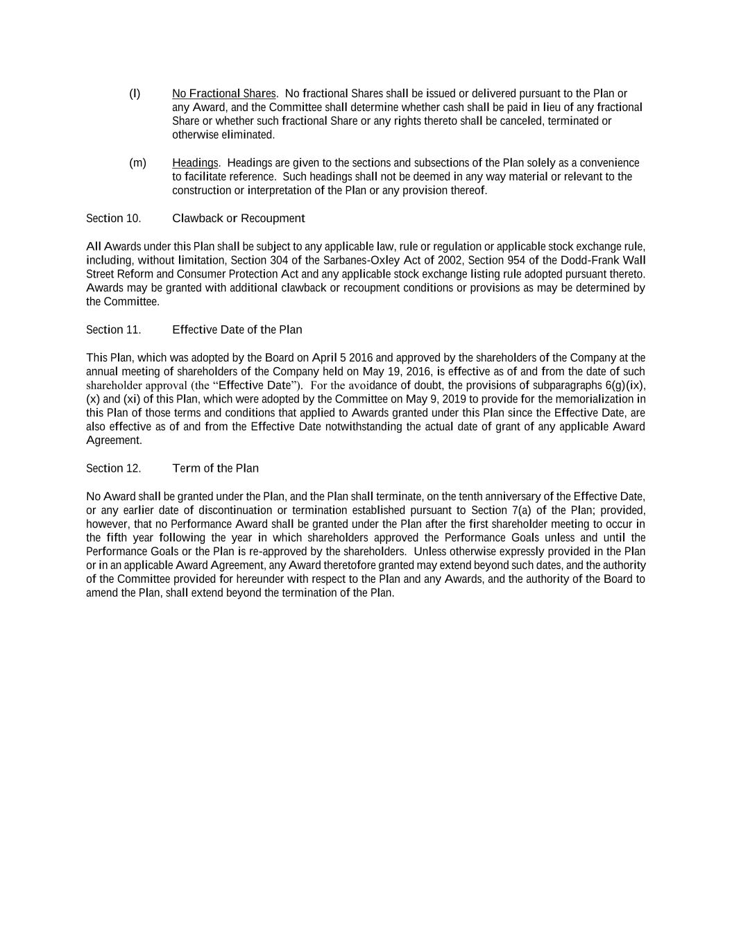 (l) No Fractional Shares. No fractional Shares shall be issued or delivered pursuant to the Plan or any Award, and the Committee shall determine whether cash shall be paid in lieu of any fractional Share or whether such fractional Share or any rights thereto shall be canceled, terminated or otherwise eliminated. (m) Headings. Headings are given to the sections and subsections of the Plan solely as a convenience to facilitate reference. Such headings shall not be deemed in any way material or relevant to the construction or interpretation of the Plan or any provision thereof. Section 10. Clawback or Recoupment All Awards under this Plan shall be subject to any applicable law, rule or regulation or applicable stock exchange rule, including, without limitation, Section 304 of the Sarbanes-Oxley Act of 2002, Section 954 of the Dodd-Frank Wall Street Reform and Consumer Protection Act and any applicable stock exchange listing rule adopted pursuant thereto. Awards may be granted with additional clawback or recoupment conditions or provisions as may be determined by the Committee. Section 11. Effective Date of the Plan This Plan, which was adopted by the Board on April 5 2016 and approved by the shareholders of the Company at the annual meeting of shareholders of the Company held on May 19, 2016, is effective as of and from the date of such shareholder approval (the “Effective Date”). For the avoidance of doubt, the provisions of subparagraphs 6(g)(ix), (x) and (xi) of this Plan, which were adopted by the Committee on May 9, 2019 to provide for the memorialization in this Plan of those terms and conditions that applied to Awards granted under this Plan since the Effective Date, are also effective as of and from the Effective Date notwithstanding the actual date of grant of any applicable Award Agreement. Section 12. Term of the Plan No Award shall be granted under the Plan, and the Plan shall terminate, on the tenth anniversary of the Effective Date, or any earlier date of discontinuation or termination established pursuant to Section 7(a) of the Plan; provided, however, that no Performance Award shall be granted under the Plan after the first shareholder meeting to occur in the fifth year following the year in which shareholders approved the Performance Goals unless and until the Performance Goals or the Plan is re-approved by the shareholders. Unless otherwise expressly provided in the Plan or in an applicable Award Agreement, any Award theretofore granted may extend beyond such dates, and the authority of the Committee provided for hereunder with respect to the Plan and any Awards, and the authority of the Board to amend the Plan, shall extend beyond the termination of the Plan.
