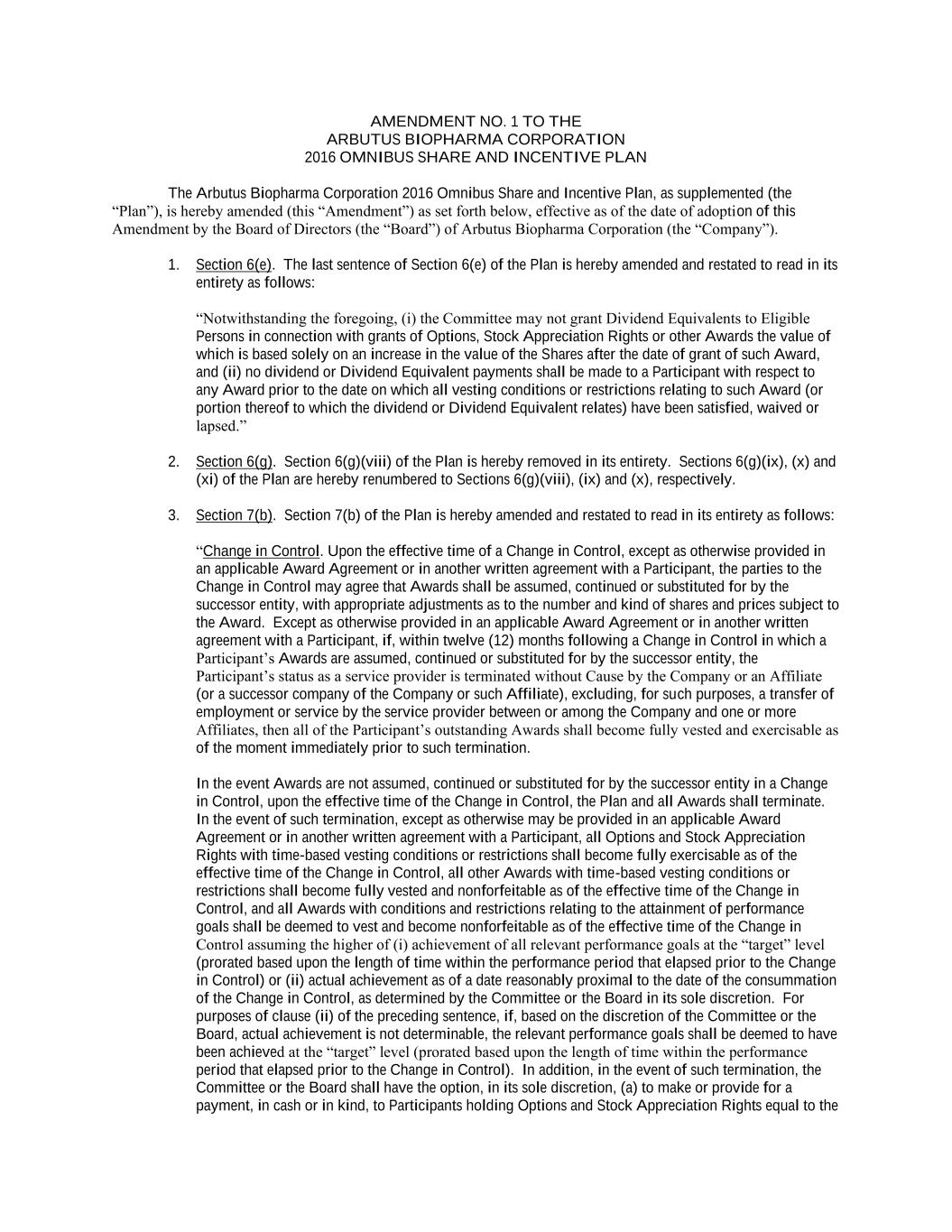 AMENDMENT NO. 1 TO THE ARBUTUS BIOPHARMA CORPORATION 2016 OMNIBUS SHARE AND INCENTIVE PLAN The Arbutus Biopharma Corporation 2016 Omnibus Share and Incentive Plan, as supplemented (the “Plan”), is hereby amended (this “Amendment”) as set forth below, effective as of the date of adoption of this Amendment by the Board of Directors (the “Board”) of Arbutus Biopharma Corporation (the “Company”). 1. Section 6(e). The last sentence of Section 6(e) of the Plan is hereby amended and restated to read in its entirety as follows: “Notwithstanding the foregoing, (i) the Committee may not grant Dividend Equivalents to Eligible Persons in connection with grants of Options, Stock Appreciation Rights or other Awards the value of which is based solely on an increase in the value of the Shares after the date of grant of such Award, and (ii) no dividend or Dividend Equivalent payments shall be made to a Participant with respect to any Award prior to the date on which all vesting conditions or restrictions relating to such Award (or portion thereof to which the dividend or Dividend Equivalent relates) have been satisfied, waived or lapsed.” 2. Section 6(g). Section 6(g)(viii) of the Plan is hereby removed in its entirety. Sections 6(g)(ix), (x) and (xi) of the Plan are hereby renumbered to Sections 6(g)(viii), (ix) and (x), respectively. 3. Section 7(b). Section 7(b) of the Plan is hereby amended and restated to read in its entirety as follows: “Change in Control. Upon the effective time of a Change in Control, except as otherwise provided in an applicable Award Agreement or in another written agreement with a Participant, the parties to the Change in Control may agree that Awards shall be assumed, continued or substituted for by the successor entity, with appropriate adjustments as to the number and kind of shares and prices subject to the Award. Except as otherwise provided in an applicable Award Agreement or in another written agreement with a Participant, if, within twelve (12) months following a Change in Control in which a Participant’s Awards are assumed, continued or substituted for by the successor entity, the Participant’s status as a service provider is terminated without Cause by the Company or an Affiliate (or a successor company of the Company or such Affiliate), excluding, for such purposes, a transfer of employment or service by the service provider between or among the Company and one or more Affiliates, then all of the Participant’s outstanding Awards shall become fully vested and exercisable as of the moment immediately prior to such termination. In the event Awards are not assumed, continued or substituted for by the successor entity in a Change in Control, upon the effective time of the Change in Control, the Plan and all Awards shall terminate. In the event of such termination, except as otherwise may be provided in an applicable Award Agreement or in another written agreement with a Participant, all Options and Stock Appreciation Rights with time-based vesting conditions or restrictions shall become fully exercisable as of the effective time of the Change in Control, all other Awards with time-based vesting conditions or restrictions shall become fully vested and nonforfeitable as of the effective time of the Change in Control, and all Awards with conditions and restrictions relating to the attainment of performance goals shall be deemed to vest and become nonforfeitable as of the effective time of the Change in Control assuming the higher of (i) achievement of all relevant performance goals at the “target” level (prorated based upon the length of time within the performance period that elapsed prior to the Change in Control) or (ii) actual achievement as of a date reasonably proximal to the date of the consummation of the Change in Control, as determined by the Committee or the Board in its sole discretion. For purposes of clause (ii) of the preceding sentence, if, based on the discretion of the Committee or the Board, actual achievement is not determinable, the relevant performance goals shall be deemed to have been achieved at the “target” level (prorated based upon the length of time within the performance period that elapsed prior to the Change in Control). In addition, in the event of such termination, the Committee or the Board shall have the option, in its sole discretion, (a) to make or provide for a payment, in cash or in kind, to Participants holding Options and Stock Appreciation Rights equal to the