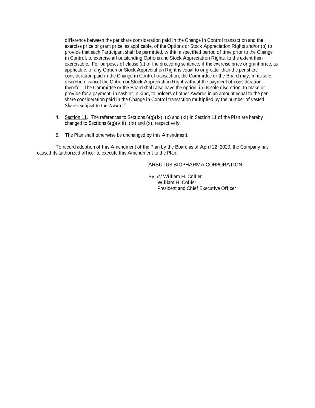 difference between the per share consideration paid in the Change in Control transaction and the exercise price or grant price, as applicable, of the Options or Stock Appreciation Rights and/or (b) to provide that each Participant shall be permitted, within a specified period of time prior to the Change in Control, to exercise all outstanding Options and Stock Appreciation Rights, to the extent then exercisable. For purposes of clause (a) of the preceding sentence, if the exercise price or grant price, as applicable, of any Option or Stock Appreciation Right is equal to or greater than the per share consideration paid in the Change in Control transaction, the Committee or the Board may, in its sole discretion, cancel the Option or Stock Appreciation Right without the payment of consideration therefor. The Committee or the Board shall also have the option, in its sole discretion, to make or provide for a payment, in cash or in kind, to holders of other Awards in an amount equal to the per share consideration paid in the Change in Control transaction multiplied by the number of vested Shares subject to the Award.” 4. Section 11. The references to Sections 6(g)(ix), (x) and (xi) in Section 11 of the Plan are hereby changed to Sections 6(g)(viii), (ix) and (x), respectively. 5. The Plan shall otherwise be unchanged by this Amendment. To record adoption of this Amendment of the Plan by the Board as of April 22, 2020, the Company has caused its authorized officer to execute this Amendment to the Plan. ARBUTUS BIOPHARMA CORPORATION By: /s/ William H. Collier William H. Collier President and Chief Executive Officer