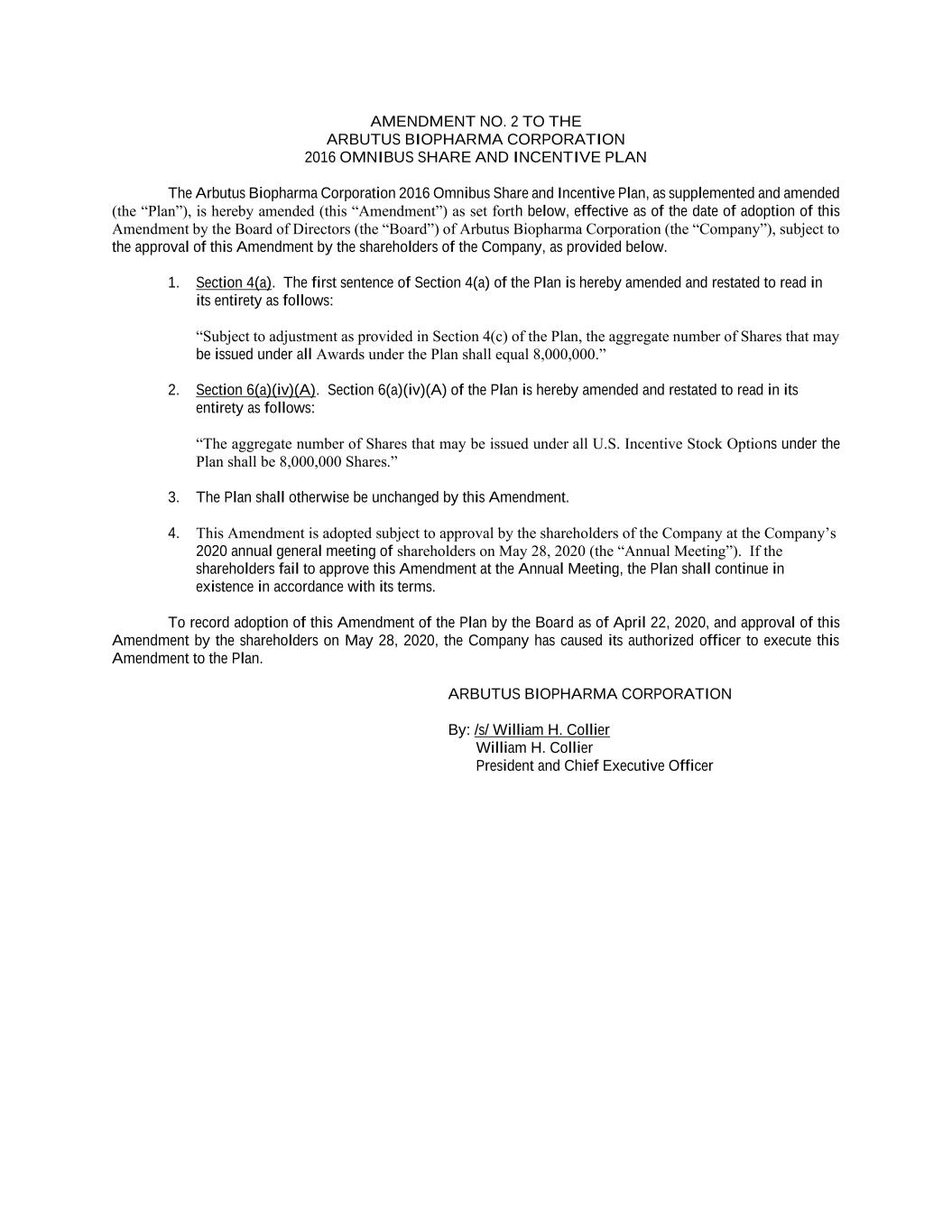 AMENDMENT NO. 2 TO THE ARBUTUS BIOPHARMA CORPORATION 2016 OMNIBUS SHARE AND INCENTIVE PLAN The Arbutus Biopharma Corporation 2016 Omnibus Share and Incentive Plan, as supplemented and amended (the “Plan”), is hereby amended (this “Amendment”) as set forth below, effective as of the date of adoption of this Amendment by the Board of Directors (the “Board”) of Arbutus Biopharma Corporation (the “Company”), subject to the approval of this Amendment by the shareholders of the Company, as provided below. 1. Section 4(a). The first sentence of Section 4(a) of the Plan is hereby amended and restated to read in its entirety as follows: “Subject to adjustment as provided in Section 4(c) of the Plan, the aggregate number of Shares that may be issued under all Awards under the Plan shall equal 8,000,000.” 2. Section 6(a)(iv)(A). Section 6(a)(iv)(A) of the Plan is hereby amended and restated to read in its entirety as follows: “The aggregate number of Shares that may be issued under all U.S. Incentive Stock Options under the Plan shall be 8,000,000 Shares.” 3. The Plan shall otherwise be unchanged by this Amendment. 4. This Amendment is adopted subject to approval by the shareholders of the Company at the Company’s 2020 annual general meeting of shareholders on May 28, 2020 (the “Annual Meeting”). If the shareholders fail to approve this Amendment at the Annual Meeting, the Plan shall continue in existence in accordance with its terms. To record adoption of this Amendment of the Plan by the Board as of April 22, 2020, and approval of this Amendment by the shareholders on May 28, 2020, the Company has caused its authorized officer to execute this Amendment to the Plan. ARBUTUS BIOPHARMA CORPORATION By: /s/ William H. Collier William H. Collier President and Chief Executive Officer