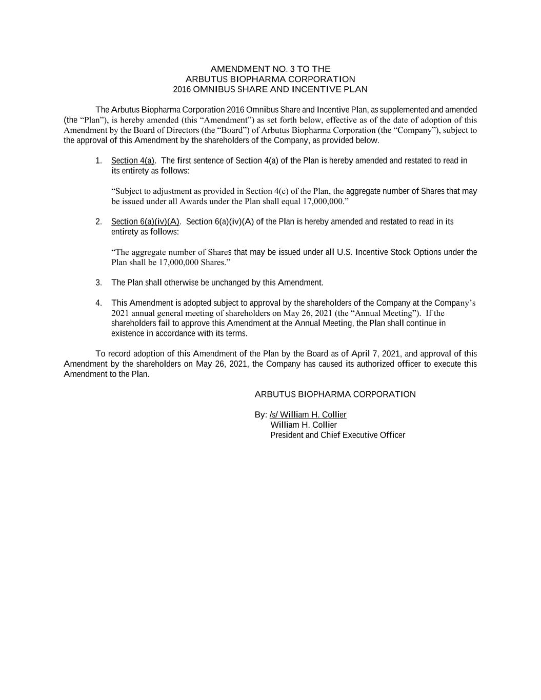AMENDMENT NO. 3 TO THE ARBUTUS BIOPHARMA CORPORATION 2016 OMNIBUS SHARE AND INCENTIVE PLAN The Arbutus Biopharma Corporation 2016 Omnibus Share and Incentive Plan, as supplemented and amended (the “Plan”), is hereby amended (this “Amendment”) as set forth below, effective as of the date of adoption of this Amendment by the Board of Directors (the “Board”) of Arbutus Biopharma Corporation (the “Company”), subject to the approval of this Amendment by the shareholders of the Company, as provided below. 1. Section 4(a). The first sentence of Section 4(a) of the Plan is hereby amended and restated to read in its entirety as follows: “Subject to adjustment as provided in Section 4(c) of the Plan, the aggregate number of Shares that may be issued under all Awards under the Plan shall equal 17,000,000.” 2. Section 6(a)(iv)(A). Section 6(a)(iv)(A) of the Plan is hereby amended and restated to read in its entirety as follows: “The aggregate number of Shares that may be issued under all U.S. Incentive Stock Options under the Plan shall be 17,000,000 Shares.” 3. The Plan shall otherwise be unchanged by this Amendment. 4. This Amendment is adopted subject to approval by the shareholders of the Company at the Company’s 2021 annual general meeting of shareholders on May 26, 2021 (the “Annual Meeting”). If the shareholders fail to approve this Amendment at the Annual Meeting, the Plan shall continue in existence in accordance with its terms. To record adoption of this Amendment of the Plan by the Board as of April 7, 2021, and approval of this Amendment by the shareholders on May 26, 2021, the Company has caused its authorized officer to execute this Amendment to the Plan. ARBUTUS BIOPHARMA CORPORATION By: /s/ William H. Collier William H. Collier President and Chief Executive Officer
