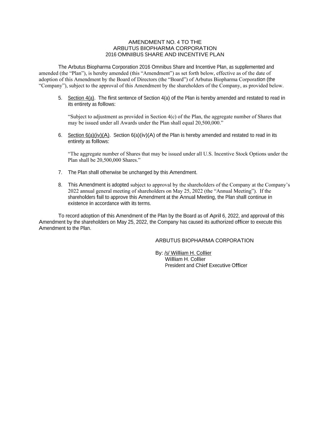 AMENDMENT NO. 4 TO THE ARBUTUS BIOPHARMA CORPORATION 2016 OMNIBUS SHARE AND INCENTIVE PLAN The Arbutus Biopharma Corporation 2016 Omnibus Share and Incentive Plan, as supplemented and amended (the “Plan”), is hereby amended (this “Amendment”) as set forth below, effective as of the date of adoption of this Amendment by the Board of Directors (the “Board”) of Arbutus Biopharma Corporation (the “Company”), subject to the approval of this Amendment by the shareholders of the Company, as provided below. 5. Section 4(a). The first sentence of Section 4(a) of the Plan is hereby amended and restated to read in its entirety as follows: “Subject to adjustment as provided in Section 4(c) of the Plan, the aggregate number of Shares that may be issued under all Awards under the Plan shall equal 20,500,000.” 6. Section 6(a)(iv)(A). Section 6(a)(iv)(A) of the Plan is hereby amended and restated to read in its entirety as follows: “The aggregate number of Shares that may be issued under all U.S. Incentive Stock Options under the Plan shall be 20,500,000 Shares.” 7. The Plan shall otherwise be unchanged by this Amendment. 8. This Amendment is adopted subject to approval by the shareholders of the Company at the Company’s 2022 annual general meeting of shareholders on May 25, 2022 (the “Annual Meeting”). If the shareholders fail to approve this Amendment at the Annual Meeting, the Plan shall continue in existence in accordance with its terms. To record adoption of this Amendment of the Plan by the Board as of April 6, 2022, and approval of this Amendment by the shareholders on May 25, 2022, the Company has caused its authorized officer to execute this Amendment to the Plan. ARBUTUS BIOPHARMA CORPORATION By: /s/ William H. Collier William H. Collier President and Chief Executive Officer
