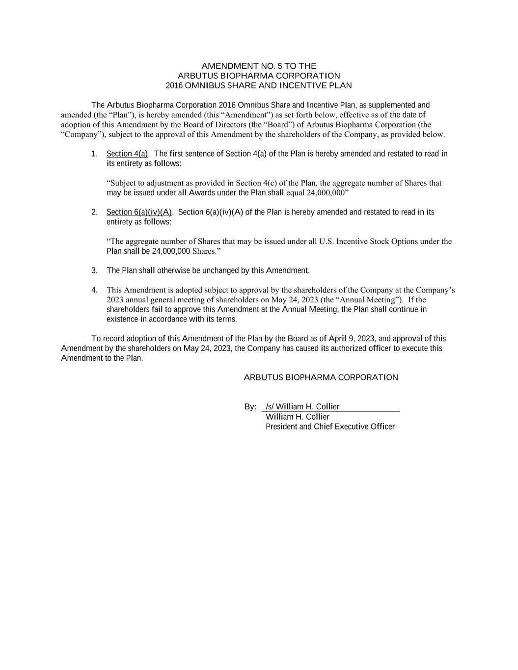 AMENDMENT NO. 5 TO THE ARBUTUS BIOPHARMA CORPORATION 2016 OMNIBUS SHARE AND INCENTIVE PLAN The Arbutus Biopharma Corporation 2016 Omnibus Share and Incentive Plan, as supplemented and amended (the “Plan”), is hereby amended (this “Amendment”) as set forth below, effective as of the date of adoption of this Amendment by the Board of Directors (the “Board”) of Arbutus Biopharma Corporation (the “Company”), subject to the approval of this Amendment by the shareholders of the Company, as provided below. 1. Section 4(a). The first sentence of Section 4(a) of the Plan is hereby amended and restated to read in its entirety as follows: “Subject to adjustment as provided in Section 4(c) of the Plan, the aggregate number of Shares that may be issued under all Awards under the Plan shall equal 24,000,000” 2. Section 6(a)(iv)(A). Section 6(a)(iv)(A) of the Plan is hereby amended and restated to read in its entirety as follows: “The aggregate number of Shares that may be issued under all U.S. Incentive Stock Options under the Plan shall be 24,000,000 Shares.” 3. The Plan shall otherwise be unchanged by this Amendment. 4. This Amendment is adopted subject to approval by the shareholders of the Company at the Company’s 2023 annual general meeting of shareholders on May 24, 2023 (the “Annual Meeting”). If the shareholders fail to approve this Amendment at the Annual Meeting, the Plan shall continue in existence in accordance with its terms. To record adoption of this Amendment of the Plan by the Board as of April 9, 2023, and approval of this Amendment by the shareholders on May 24, 2023, the Company has caused its authorized officer to execute this Amendment to the Plan. ARBUTUS BIOPHARMA CORPORATION By: /s/ William H. Collier William H. Collier President and Chief Executive Officer