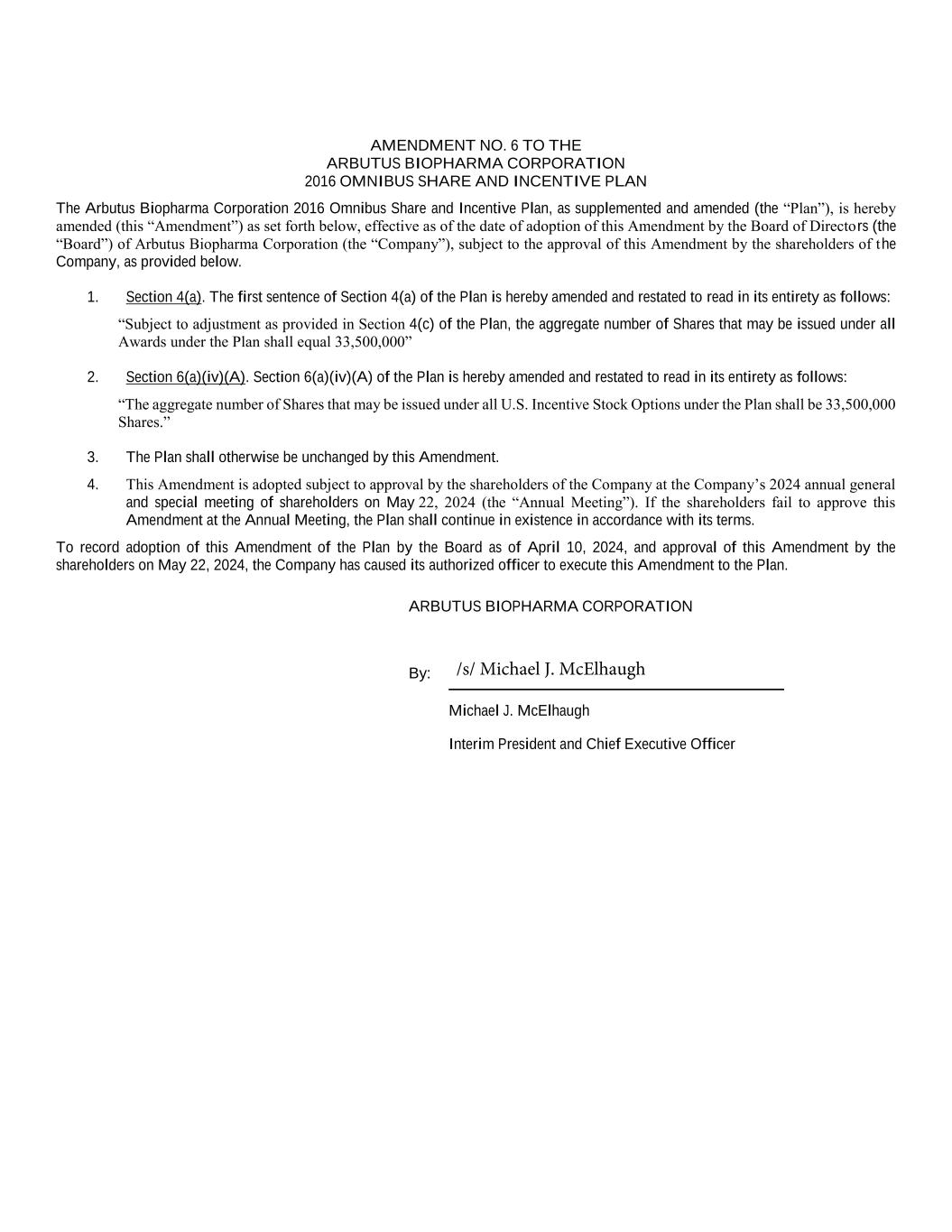 AMENDMENT NO. 6 TO THE ARBUTUS BIOPHARMA CORPORATION 2016 OMNIBUS SHARE AND INCENTIVE PLAN The Arbutus Biopharma Corporation 2016 Omnibus Share and Incentive Plan, as supplemented and amended (the “Plan”), is hereby amended (this “Amendment”) as set forth below, effective as of the date of adoption of this Amendment by the Board of Directors (the “Board”) of Arbutus Biopharma Corporation (the “Company”), subject to the approval of this Amendment by the shareholders of the Company, as provided below. 1. Section 4(a). The first sentence of Section 4(a) of the Plan is hereby amended and restated to read in its entirety as follows: “Subject to adjustment as provided in Section 4(c) of the Plan, the aggregate number of Shares that may be issued under all Awards under the Plan shall equal 33,500,000” 2. Section 6(a)(iv)(A). Section 6(a)(iv)(A) of the Plan is hereby amended and restated to read in its entirety as follows: “The aggregate number of Shares that may be issued under all U.S. Incentive Stock Options under the Plan shall be 33,500,000 Shares.” 3. The Plan shall otherwise be unchanged by this Amendment. 4. This Amendment is adopted subject to approval by the shareholders of the Company at the Company’s 2024 annual general and special meeting of shareholders on May 22, 2024 (the “Annual Meeting”). If the shareholders fail to approve this Amendment at the Annual Meeting, the Plan shall continue in existence in accordance with its terms. To record adoption of this Amendment of the Plan by the Board as of April 10, 2024, and approval of this Amendment by the shareholders on May 22, 2024, the Company has caused its authorized officer to execute this Amendment to the Plan. ARBUTUS BIOPHARMA CORPORATION By: Michael J. McElhaugh Interim President and Chief Executive Officer /s/ Michael J. McElhaugh