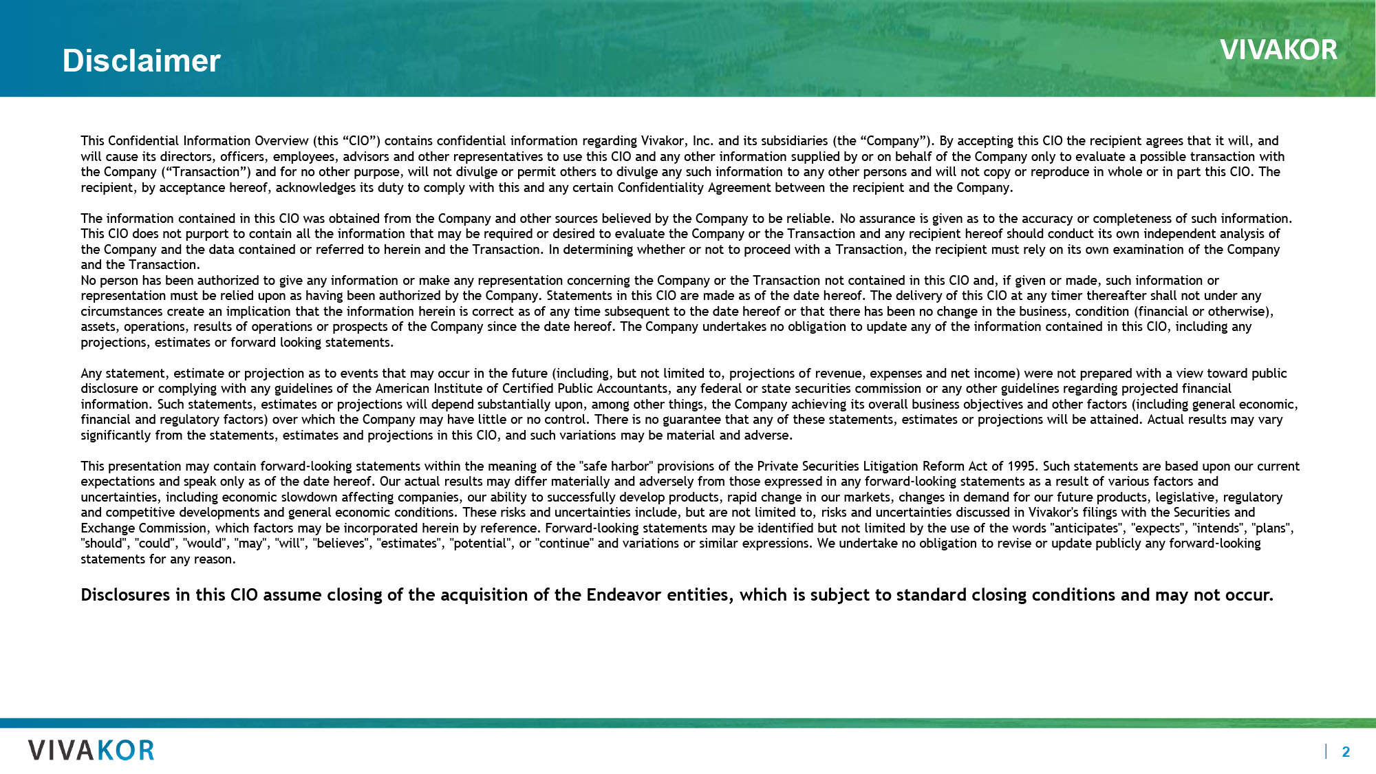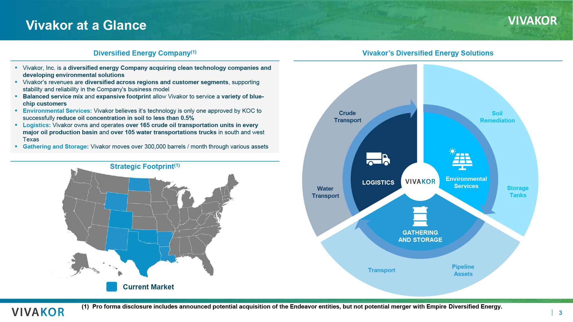 VIVAKOR 2 Disclaimer This Confidential Information Overview (this “CIO”) contains confidential information regarding Vivakor , Inc. and its subsidiaries (the “Company”). By accepting this CIO the recipient agrees that it will, and will cause its directors, officers, employees, advisors and other representatives to use this CIO and any other information s upp lied by or on behalf of the Company only to evaluate a possible transaction with the Company (“Transaction”) and for no other purpose, will not divulge or permit others to divulge any such information to an y o ther persons and will not copy or reproduce in whole or in part this CIO. The recipient, by acceptance hereof, acknowledges its duty to comply with this and any certain Confidentiality Agreement between the recipient and the Company. The information contained in this CIO was obtained from the Company and other sources believed by the Company to be reliable. No assurance is given as to the accuracy or completeness of such information. This CIO does not purport to contain all the information that may be required or desired to evaluate the Company or the Trans act ion and any recipient hereof should conduct its own independent analysis of the Company and the data contained or referred to herein and the Transaction. In determining whether or not to proceed with a Tr ansaction, the recipient must rely on its own examination of the Company and the Transaction. No person has been authorized to give any information or make any representation concerning the Company or the Transaction no t c ontained in this CIO and, if given or made, such information or representation must be relied upon as having been authorized by the Company. Statements in this CIO are made as of the date h ere of. The delivery of this CIO at any timer thereafter shall not under any circumstances create an implication that the information herein is correct as of any time subsequent to the date hereof or th at there has been no change in the business, condition (financial or otherwise), assets, operations, results of operations or prospects of the Company since the date hereof. The Company undertakes no obliga tio n to update any of the information contained in this CIO, including any projections, estimates or forward looking statements. Any statement, estimate or projection as to events that may occur in the future (including, but not limited to, projections o f r evenue, expenses and net income) were not prepared with a view toward public disclosure or complying with any guidelines of the American Institute of Certified Public Accountants, any federal or state s ecu rities commission or any other guidelines regarding projected financial information. Such statements, estimates or projections will depend substantially upon, among other things, the Company achiev ing its overall business objectives and other factors (including general economic, financial and regulatory factors) over which the Company may have little or no control. There is no guarantee that any of the se statements, estimates or projections will be attained. Actual results may vary significantly from the statements, estimates and projections in this CIO, and such variations may be material and adverse. This presentation may contain forward - looking statements within the meaning of the "safe harbor" provisions of the Private Secur ities Litigation Reform Act of 1995. Such statements are based upon our current expectations and speak only as of the date hereof. Our actual results may differ materially and adversely from those expresse d i n any forward - looking statements as a result of various factors and uncertainties, including economic slowdown affecting companies, our ability to successfully develop products, rapid change in ou r markets, changes in demand for our future products, legislative, regulatory and competitive developments and general economic conditions. These risks and uncertainties include, but are not limited to, ris ks and uncertainties discussed in Vivakor's filings with the Securities and Exchange Commission, which factors may be incorporated herein by reference. Forward - looking statements may be identified but not limited by the use of the words "anticipates", "expects", "intends", "plans", "should", "could", "would", "may", "will", "believes", "estimates", "potential", or "continue" and variations or similar expr ess ions. We undertake no obligation to revise or update publicly any forward - looking statements for any reason. Disclosures in this CIO assume closing of the acquisition of the Endeavor entities, which is subject to standard closing cond iti ons and may not occur. TN0 TN1 CB2