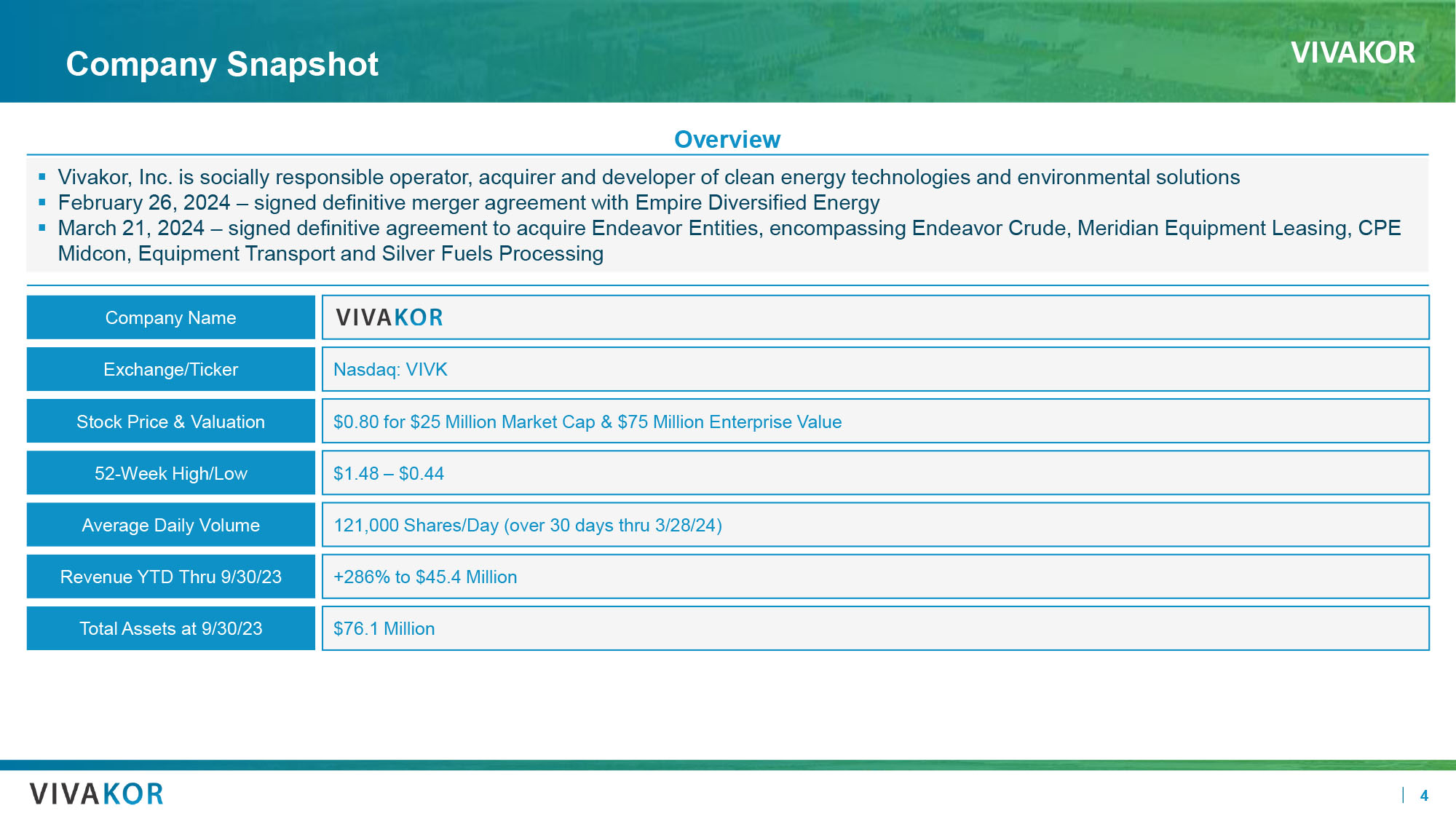 VIVAKOR 3 Vivakor at a Glance Diversified Energy Company (1) Vivakor’s Diversified Energy Solutions ▪ Vivakor, Inc. is a diversified energy Company acquiring clean technology companies and developing environmental solutions ▪ Vivakor’s revenues are diversified across regions and customer segments , supporting stability and reliability in the Company’s business model ▪ Balanced service mix and expansive footprint allow Vivakor to service a variety of blue - chip customers ▪ Environmental Services: Vivakor believes it’s technology is only one approved by KOC to successfully reduce oil concentration in soil to less than 0.5% ▪ Logistics: Vivakor owns and operates over 165 crude oil transportation units in every major oil production basin and over 105 water transportations trucks in south and west Texas ▪ Gathering and Storage: Vivakor moves over 300,000 barrels / month through various assets Strategic Footprint (1) GATHERING AND STORAGE LOGISTICS Environmental Services Transport Pipeline Assets Soil Remediation Storage Tanks Water Transport Crude Transport Current Market (1) Pro forma disclosure includes announced potential acquisition of the Endeavor entities, but not potential merger with Empire Div ersified Energy. TN0TN1 TN2 CB3