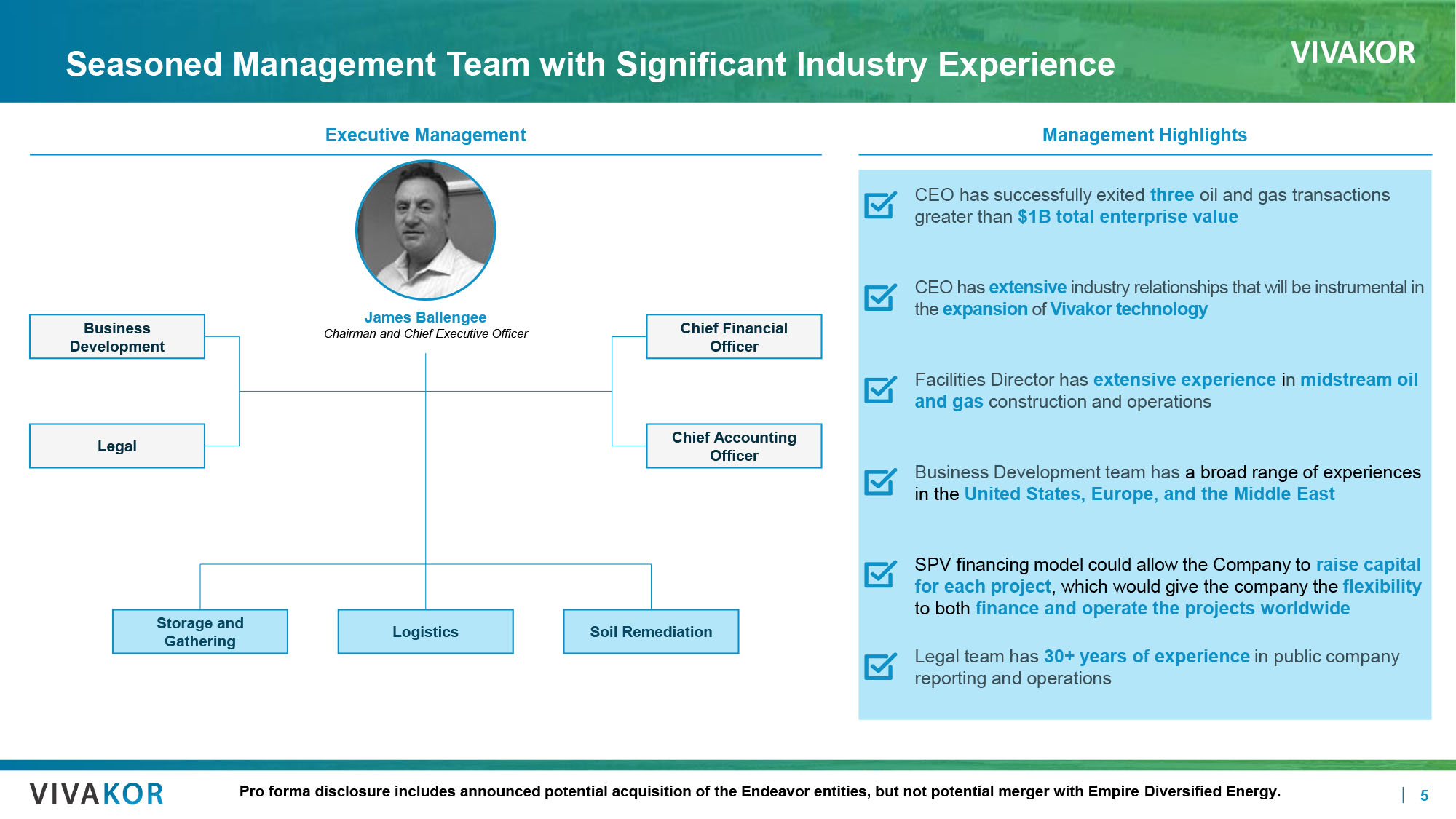 VIVAKOR 4 Company Snapshot Overview ▪ Vivakor, Inc. is socially responsible operator, acquirer and developer of clean energy technologies and environmental solutio ns ▪ February 26, 2024 – signed definitive merger agreement with Empire Diversified Energy ▪ March 21, 2024 – signed definitive agreement to acquire Endeavor Entities, encompassing Endeavor Crude, Meridian Equipment Leasi ng, CPE Midcon , Equipment Transport and Silver Fuels Processing Exchange/Ticker Nasdaq: VIVK Stock Price & Valuation $0.80 for $25 Million Market Cap & $75 Million Enterprise Value 52 - Week High/Low $1.48 – $0.44 Average Daily Volume 121,000 Shares/Day (over 30 days thru 3/28/24) Revenue YTD Thru 9/30/23 +286% to $45.4 Million Total Assets at 9/30/23 $76.1 Million Company Name