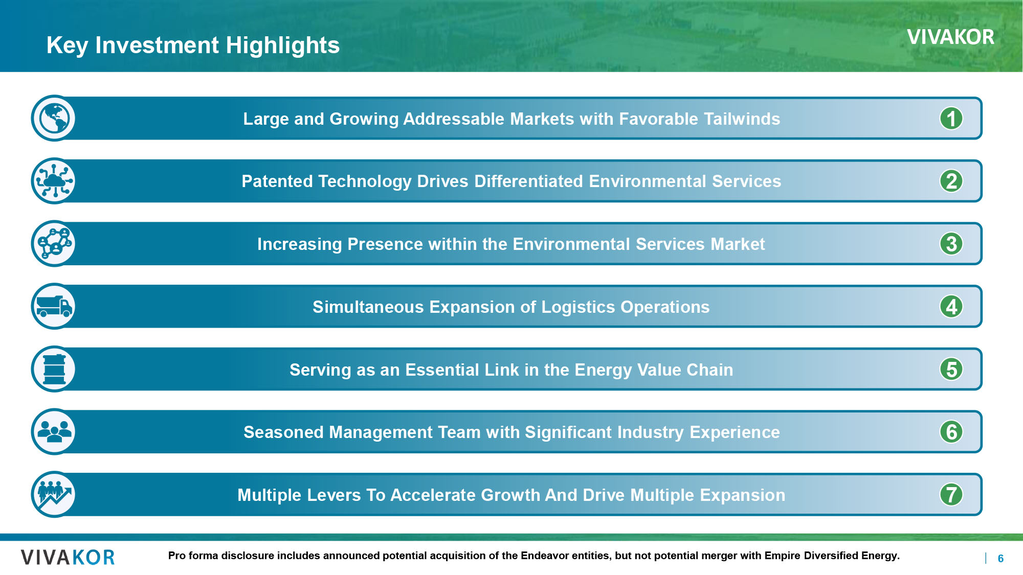 VIVAKOR 6 Key Investment Highlights Increasing Presence within the Environmental Services Market 3 Multiple Levers To Accelerate Growth And Drive Multiple Expansion 7 Seasoned Management Team with Significant Industry Experience 6 Large and Growing Addressable Markets with Favorable Tailwinds 1 Patented Technology Drives Differentiated Environmental Services 2 Simultaneous Expansion of Logistics Operations 4 Serving as an Essential Link in the Energy Value Chain 5 Pro forma disclosure includes announced potential acquisition of the Endeavor entities, but not potential merger with Empire Div ersified Energy. CB0