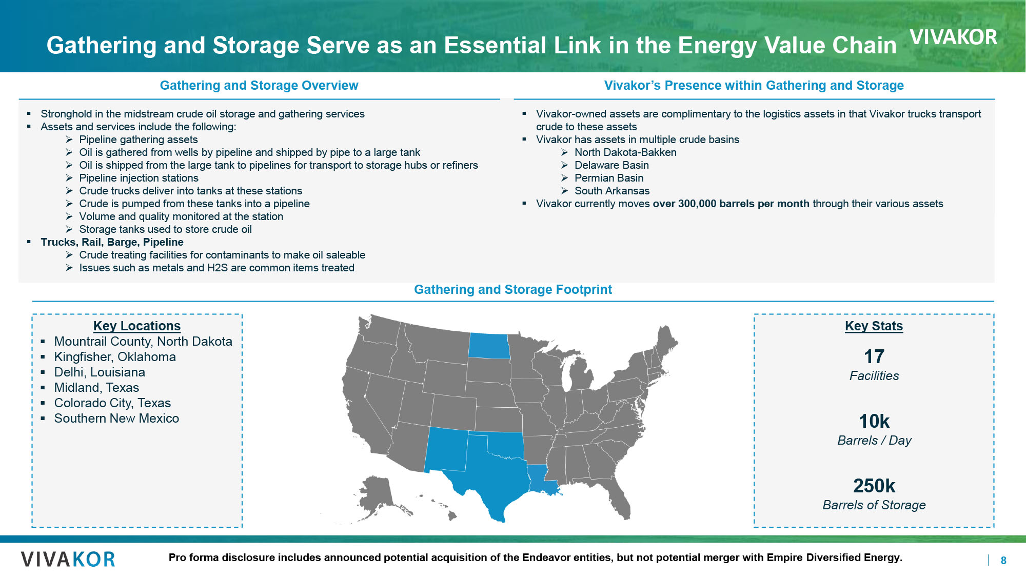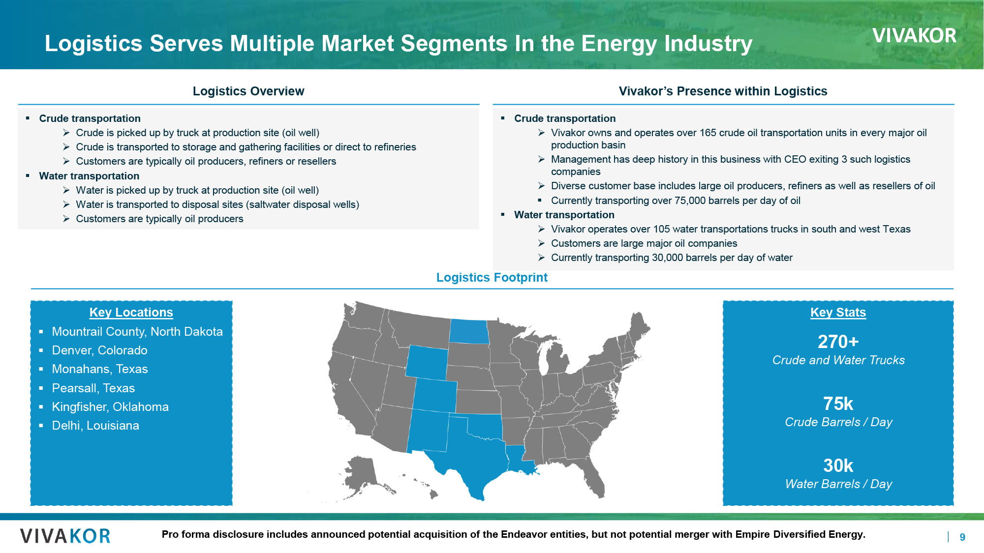 VIVAKOR 8 Gathering and Storage Serve as an Essential Link in the Energy Value Chain Gathering and Storage Overview ▪ Stronghold in the midstream crude oil storage and gathering services ▪ Assets and services include the following: » Pipeline gathering assets » Oil is gathered from wells by pipeline and shipped by pipe to a large tank » Oil is shipped from the large tank to pipelines for transport to storage hubs or refiners » Pipeline injection stations » Crude trucks deliver into tanks at these stations » Crude is pumped from these tanks into a pipeline » Volume and quality monitored at the station » Storage tanks used to store crude oil ▪ Trucks, Rail, Barge, Pipeline » Crude treating facilities for contaminants to make oil saleable » Issues such as metals and H2S are common items treated Gathering and Storage Footprint Key Locations ▪ Mountrail County, North Dakota ▪ Kingfisher, Oklahoma ▪ Delhi, Louisiana ▪ Midland, Texas ▪ Colorado City, Texas ▪ Southern New Mexico Vivakor’s Presence within Gathering and Storage ▪ Vivakor - owned assets are complimentary to the logistics assets in that Vivakor trucks transport crude to these assets ▪ Vivakor has assets in multiple crude basins » North Dakota - Bakken » Delaware Basin » Permian Basin » South Arkansas ▪ Vivakor currently moves over 300,000 barrels per month through their various assets Key Stats 17 Facilities 10k Barrels / Day 250k Barrels of Storage Pro forma disclosure includes announced potential acquisition of the Endeavor entities, but not potential merger with Empire Div ersified Energy. TN0