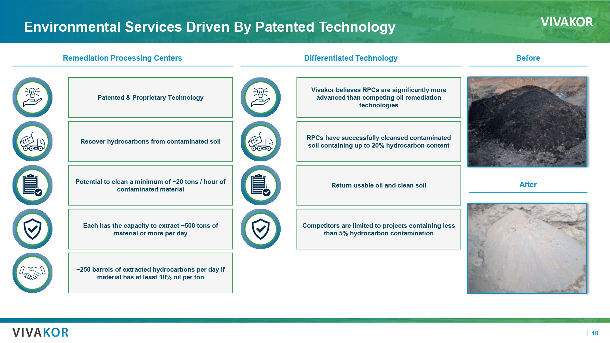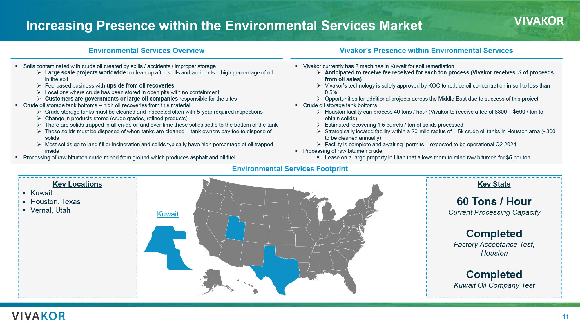 VIVAKOR 10 Environmental Services Driven By Patented Technology Recover hydrocarbons from contaminated soil Potential to clean a minimum of ~20 tons / hour of contaminated material Each has the capacity to extract ~500 tons of material or more per day ~250 barrels of extracted hydrocarbons per day if material has at least 10% oil per ton Patented & Proprietary Technology RPCs have successfully cleansed contaminated soil containing up to 20% hydrocarbon content Return usable oil and clean soil Competitors are limited to projects containing less than 5% hydrocarbon contamination Vivakor believes RPCs are significantly more advanced than competing oil remediation technologies Remediation Processing Centers Differentiated Technology Before After TN0 CB1