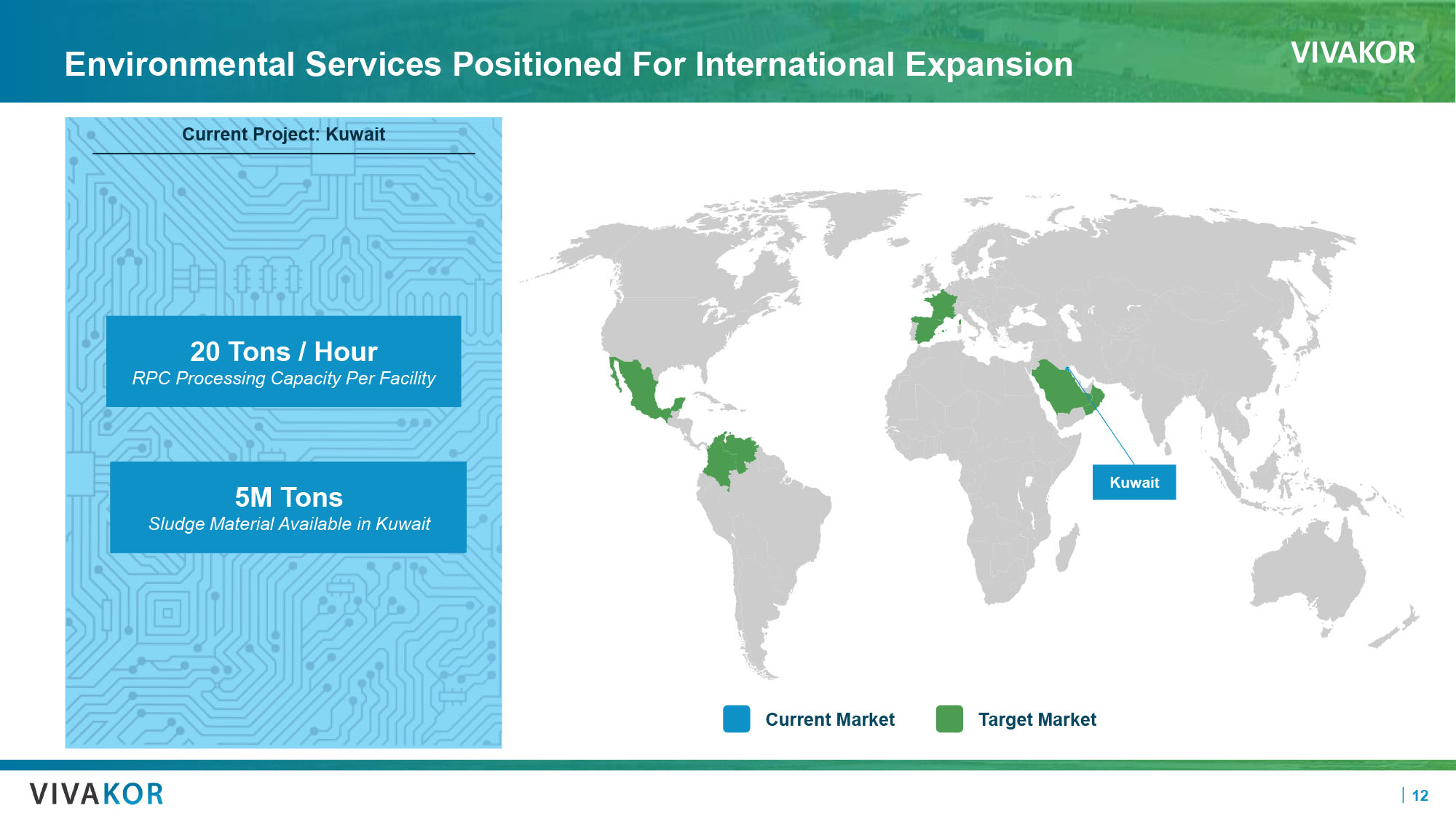 VIVAKOR 12 Environmental Services Positioned For International Expansion Current Market Target Market 5M Tons Sludge Material Available in Kuwait 20 Tons / Hour RPC Processing Capacity Per Facility Current Project: Kuwait Kuwait TN0