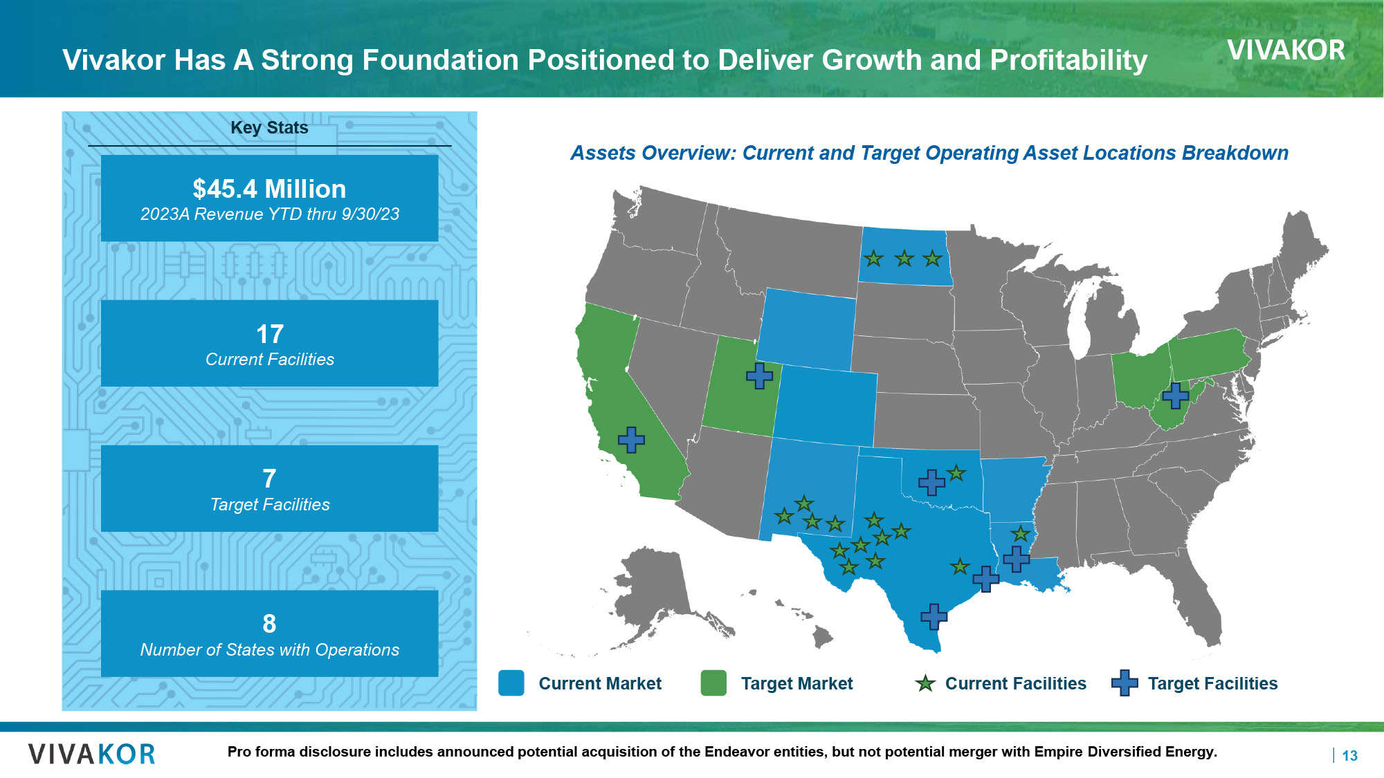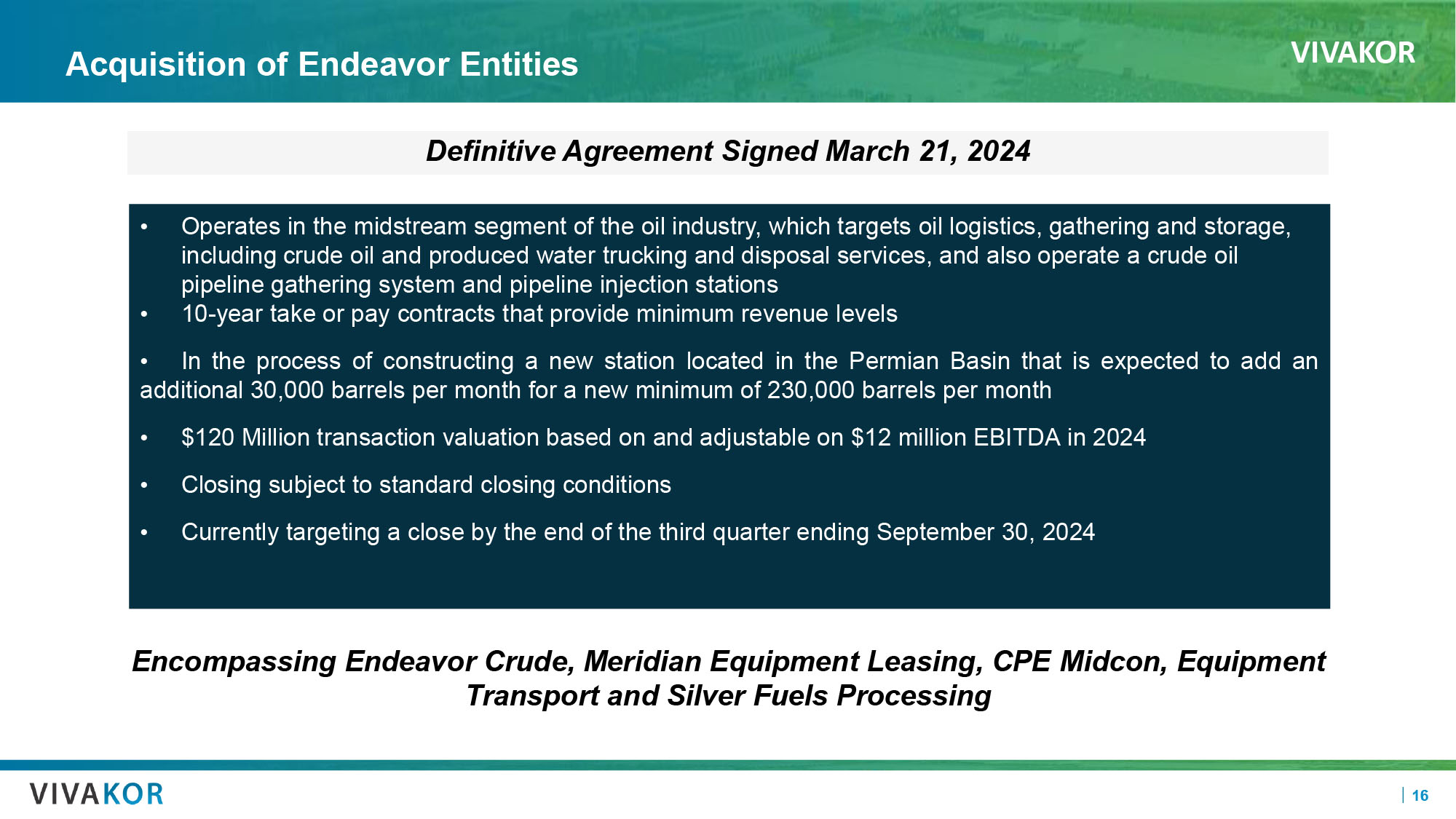 VIVAKOR 16 Acquisition of Endeavor Entities Definitive Agreement Signed March 21, 2024 • Operates in the midstream segment of the oil industry, which targets oil logistics, gathering and storage, including crude oil and produced water trucking and disposal services, and also operate a crude oil pipeline gathering system and pipeline injection stations • 10 - year take or pay contracts that provide minimum revenue levels • In the process of constructing a new station located in the Permian Basin that is expected to add an additional 30 , 000 barrels per month for a new minimum of 230 , 000 barrels per month • $ 120 Million transaction valuation based on and adjustable on $ 12 million EBITDA in 2024 • Closing subject to standard closing conditions • Currently targeting a close by the end of the third quarter ending September 30 , 2024 Encompassing Endeavor Crude, Meridian Equipment Leasing, CPE Midcon , Equipment Transport and Silver Fuels Processing CB0