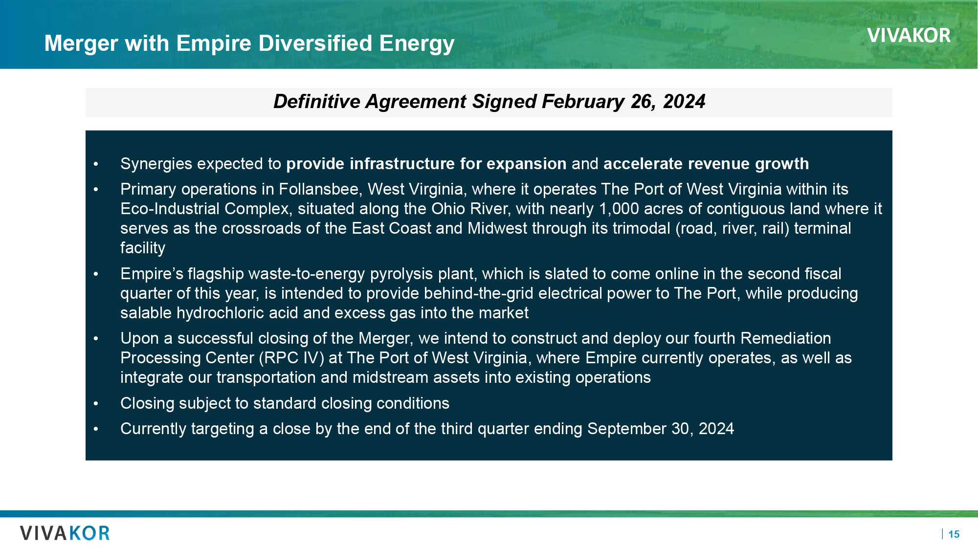 VIVAKOR 15 Merger with Empire Diversified Energy Definitive Agreement Signed February 26, 2024 • Synergies expected to provide infrastructure for expansion and accelerate revenue growth • Primary operations in Follansbee, West Virginia, where it operates The Port of West Virginia within its Eco - Industrial Complex, situated along the Ohio River, with nearly 1,000 acres of contiguous land where it serves as the crossroads of the East Coast and Midwest through its trimodal (road, river, rail) terminal facility • Empire’s flagship waste - to - energy pyrolysis plant, which is slated to come online in the second fiscal quarter of this year, is intended to provide behind - the - grid electrical power to The Port, while producing salable hydrochloric acid and excess gas into the market • Upon a successful closing of the Merger, we intend to construct and deploy our fourth Remediation Processing Center (RPC IV) at The Port of West Virginia, where Empire currently operates, as well as integrate our transportation and midstream assets into existing operations • Closing subject to standard closing conditions • Currently targeting a close by the end of the third quarter ending September 30, 2024 CB0